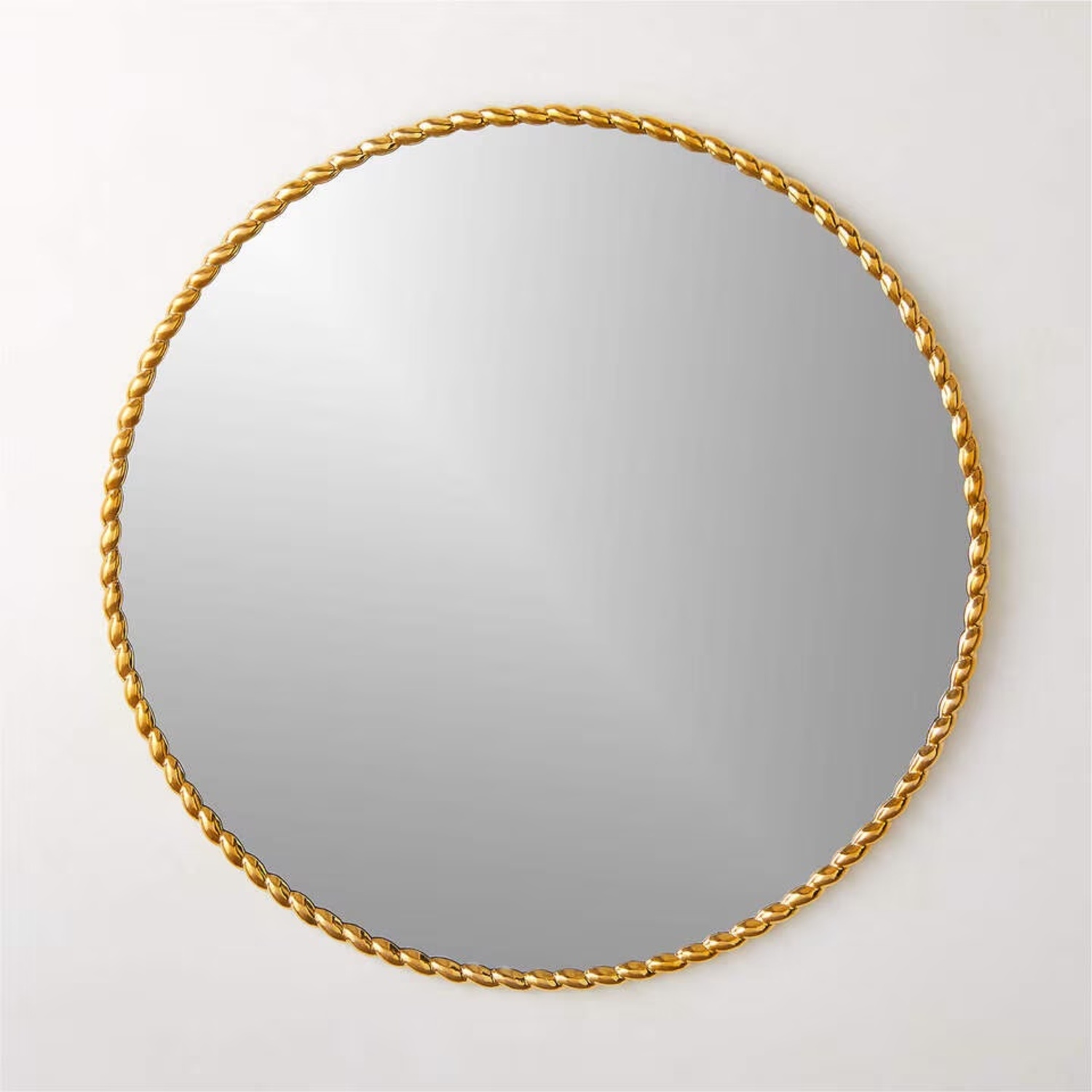 Inspired by the look of rope, solid brass delicately twists to frame the round mirror byStudio Anansi. Solid unlacquered polished brass creates an elevated look that will patina beautifully over time. Pairs with the Carrick hardware for a cohesive look. CB2 exclusive.