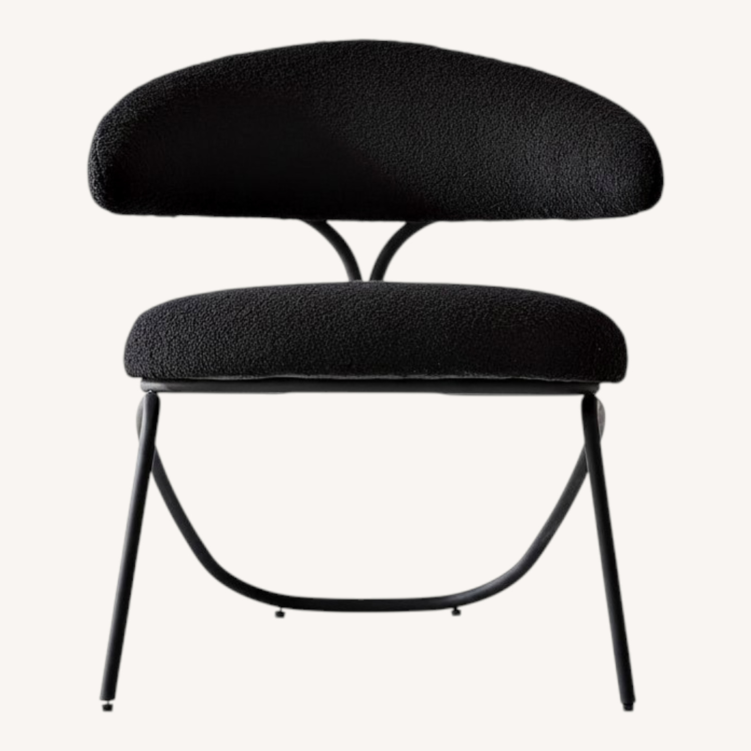 Designed by Balutto Associati, sculptural chair makes a statement in all black. Continuous black metal frame supports the curvaceous design with seat and back wrapped in luxe wool-blend boucle. CB2 exclusive.