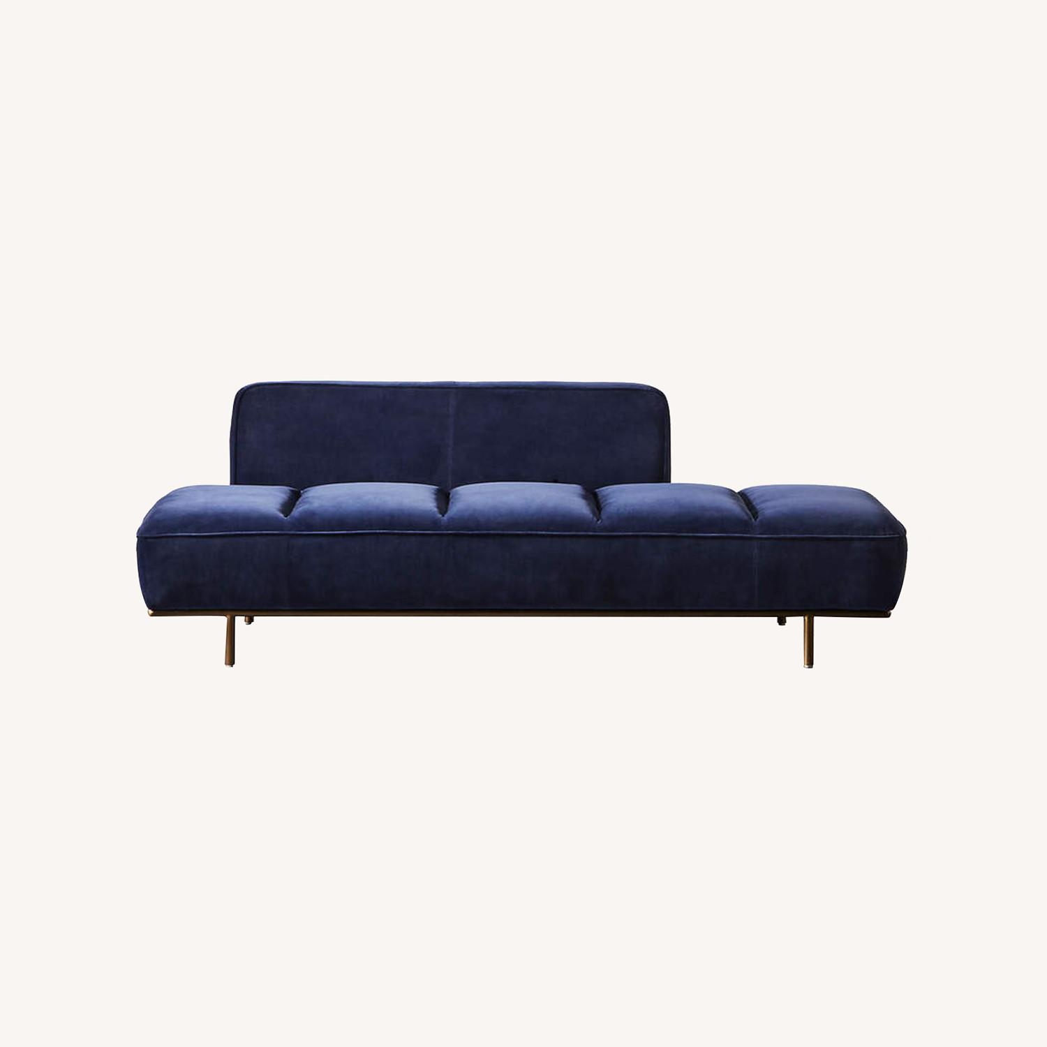 Seller's Notes:Midcentury meets so-right-now in this rich velvet daybed with gleaming brass base, designed exclusively for CB2 by Londoner Leonhard Pfeifer. A true forever piece: As soon as this daybed is delivered, it'll feel like you've had it for years. Rich navy and a brass base give this daybed a luxe feel.