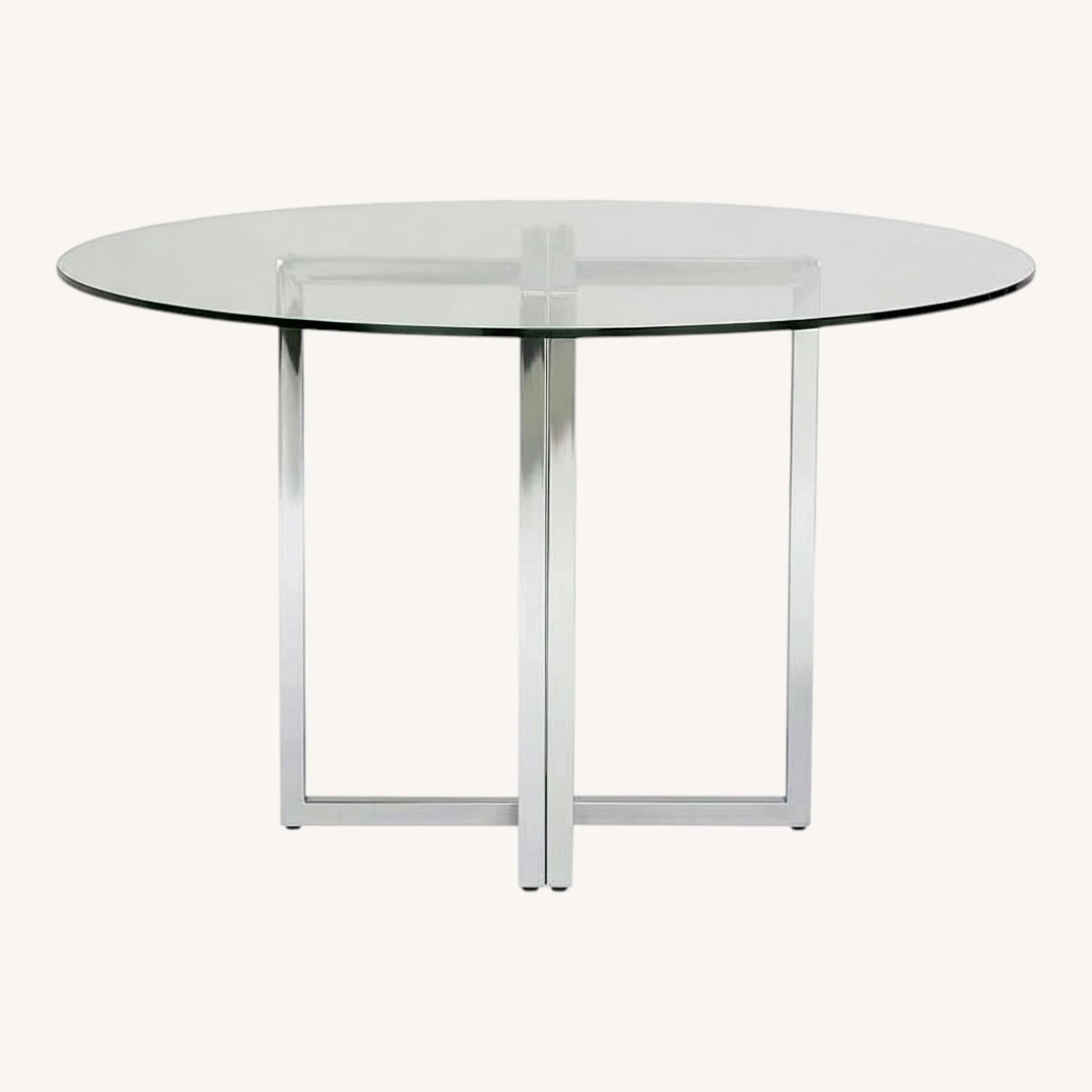 Seller's Notes:hi-yo silver. No lone rangers here. Two sleek chrome modern "sawhorses" partner with crisp, clean clear glass tops, round or rectangleyour choice. For more leg room and stability, we suggest the chrome-plated iron structures meet in the middle (shown).