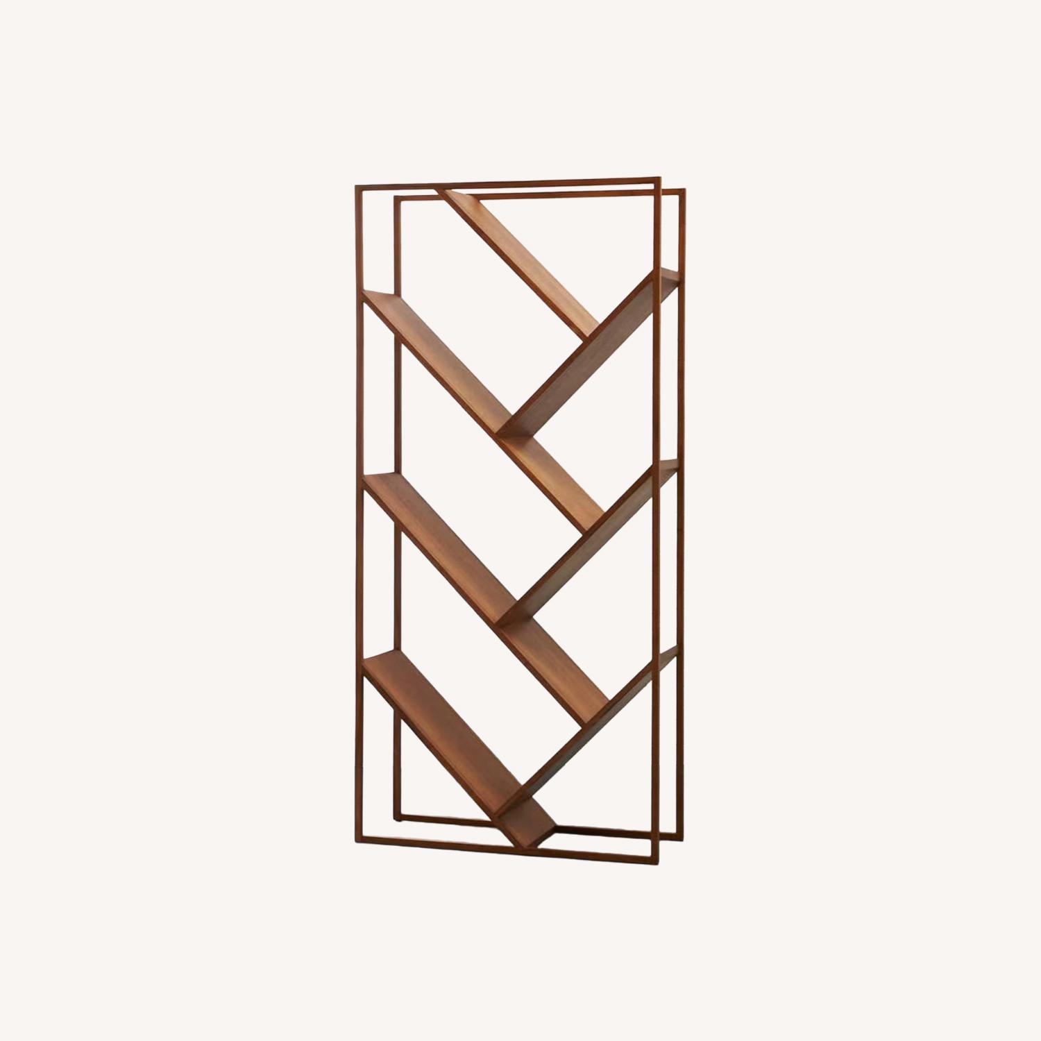 minimalist slant. Miron Lior's inventive design angles to add interest to any size space. Open solid-teak frame braces seven slanted shelves in rich wood tones and active grain. Alternating angles create an airy, uncluttered silhouette to beautifully break up a large room or divide a small studio. Displays books and disguises clutter. Double them up for added drama. v bookcase-room divider is a CB2 exclusive.