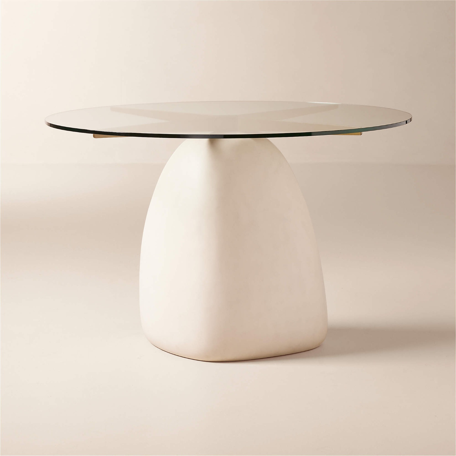 Vintage-inspired piece layers stone, brass and glass in an everyday dining table that is anything but ordinary. The Caleb Zipperer design is set on an organic-shaped stone/cement base with natural ivory tones. Four brass-plated arms extend out in large X to support a thick glass top. Table is made for four. Learn more about Caleb Zipperer on our blog. CB2 exclusive.