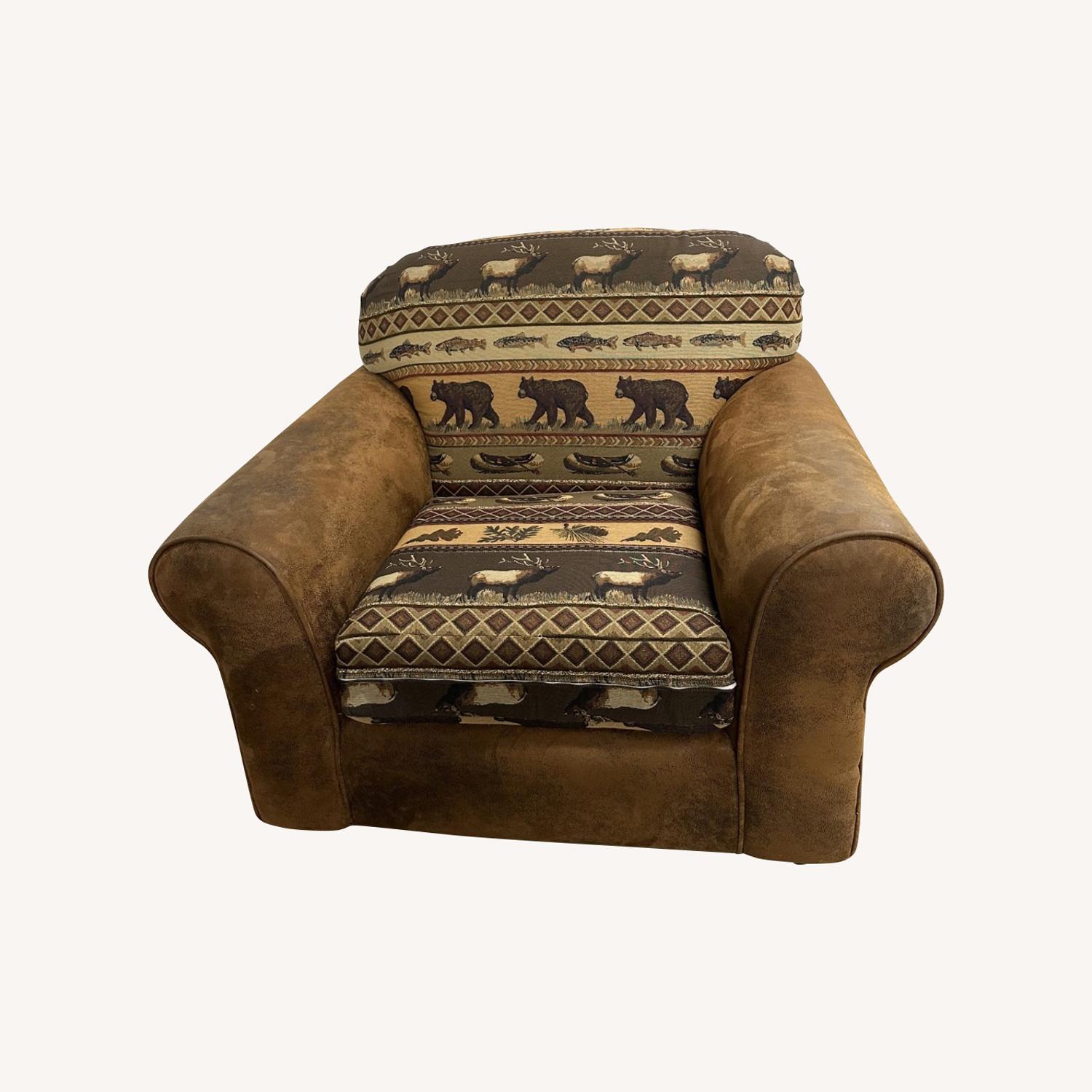 Seller's Notes:This is a beautiful and comfortable chair my by Hillcraft in the Sierra Lodge Collection. The print has bears and elk and canoes. I have two of them. You can purchase one or both. It is in great condition. It has a few scratches that are barely noticeable. Please see the pictures for measurements and condition.