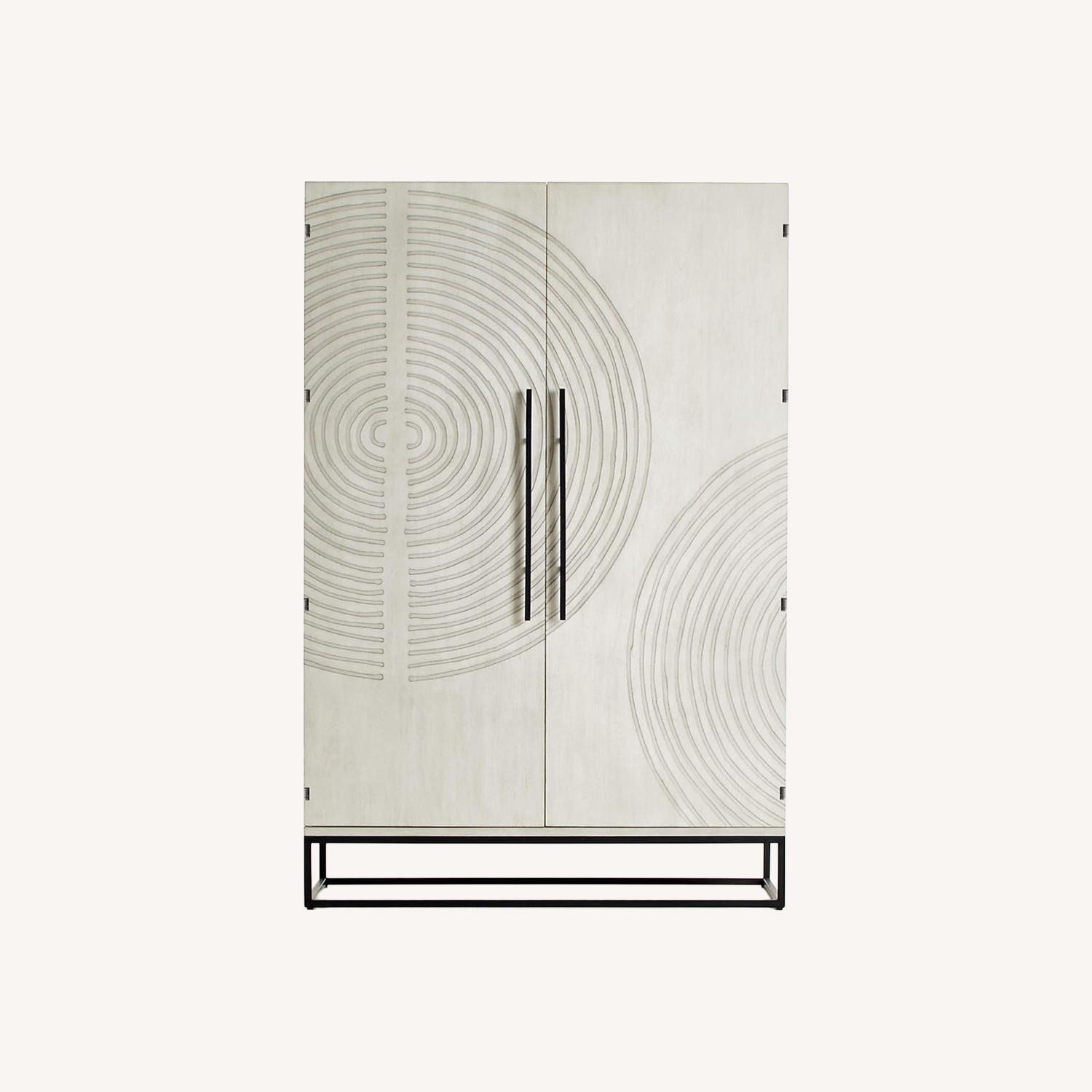 Transform your space with Circulus, a furniture collection reimagined with one-of-a-kind artistry, rhythmic pattern and a light wood finish. Incised lines with a hand-drawn look radiate out in expansive circles across the door fronts of this impressive cabinet. Accented with slim black iron pulls that match the open-frame base, the armoire opens to three shelves for ample storage. Made of birch veneer, the cabinet makes the most of its artisanal craftsmanship with a white birch finish that solves household storage with a fresh, modern look. Each piece is unique. • Birch veneer, plywood and engineered wood with birch white finish • Iron base and pulls with black finish • 1 fixed and 2 adjustable shelves • Circle design is unique to each piece