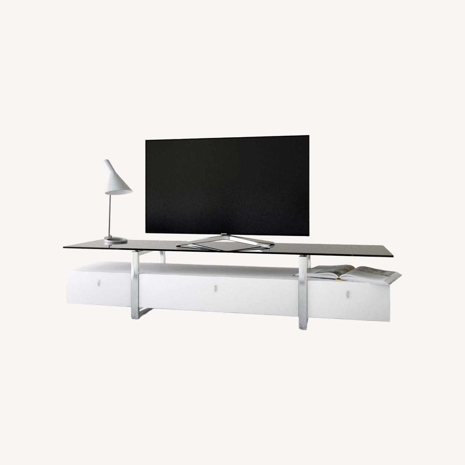 This contemporary TV Stand is ideal for living rooms with modern flare. Low profile sofas, coffee tables or sectionals? This TV-stand will serve you best. Black glass top is solid and metal chromed legs add up to the stye.