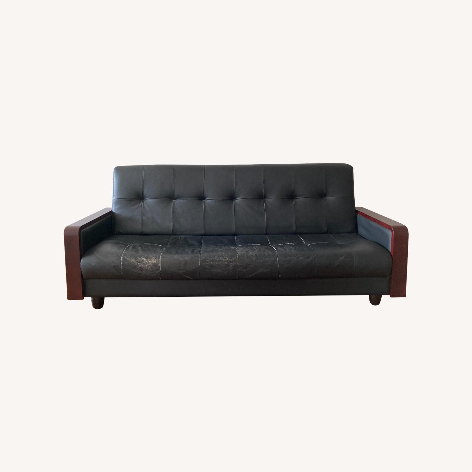 Seller's Notes:Black leather sofa with mahogany color wood armrest. Easily converts from sofa to bed. Toggle back rest in three positions: upright, 45º, flat. Ideal for small apartments, guest spaces, or home offices. From a pet/smoke-free home. Obvious wear and tear on seat area, see photos. Dimensions upright: 76w x 32d, 33h floor to top of backrest Flat bed: 67w x 42d armrest: floor to top of armrest 20h
