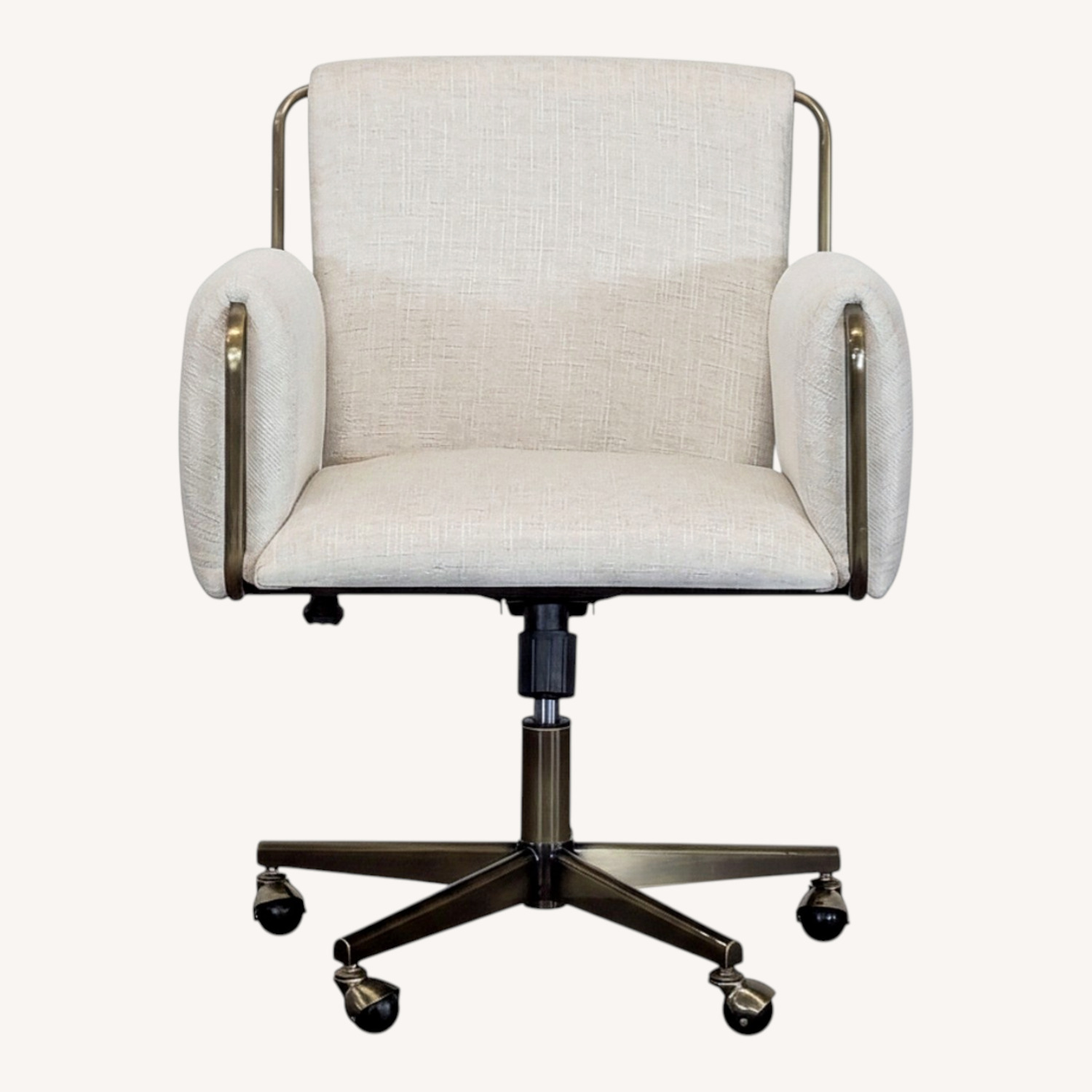 Seller's Notes:This Crate and Barrel office chair has a modern look with soft, light beige upholstery and a sturdy metal frame. The chair features padded arms, an adjustable height, and smooth-rolling wheels for easy movement. Perfect for a home office or workspace, it combines comfort and style in a compact design.