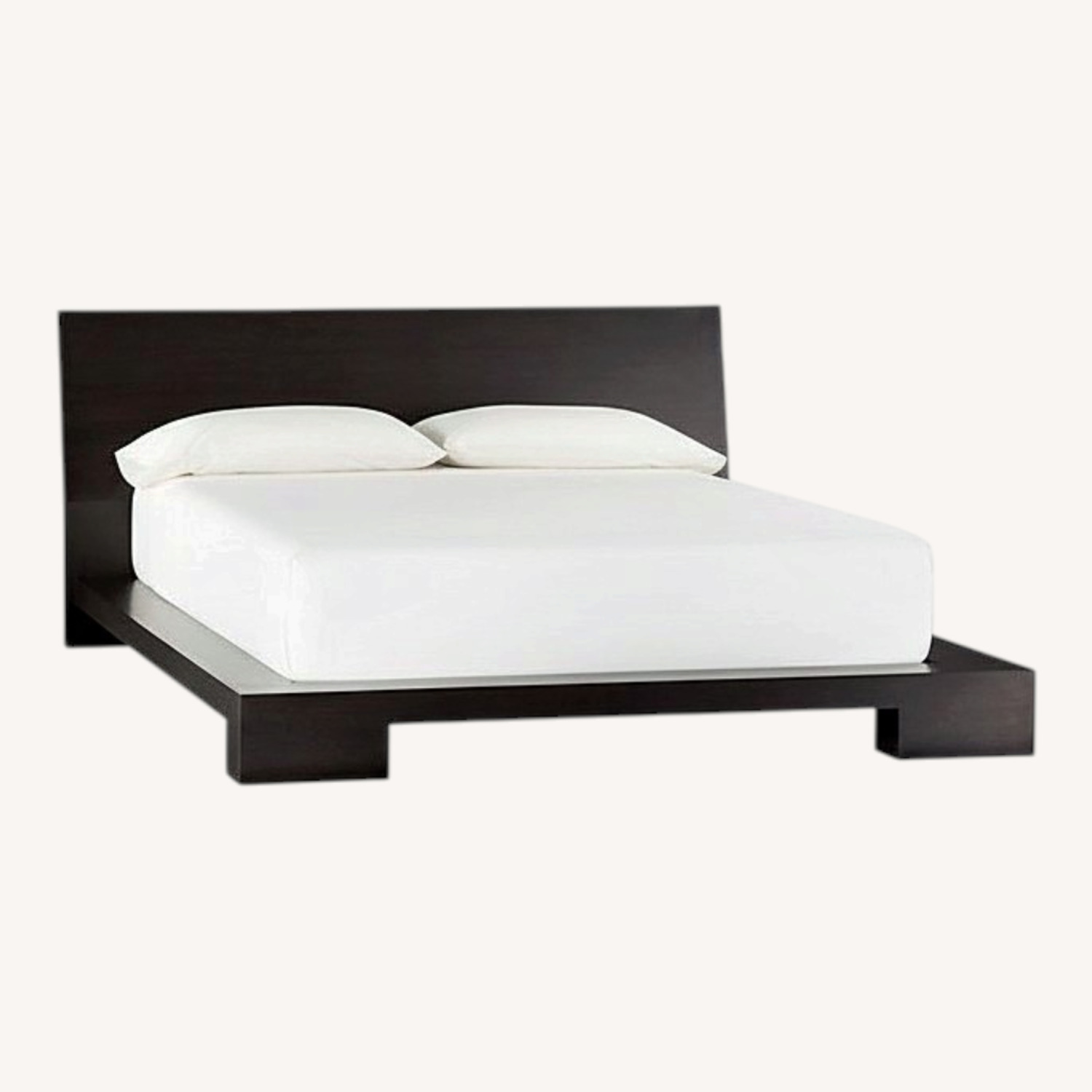 Seller's Notes:Crate and Barrel Asher king size platform bed, dark brown solid wood. Wooden slats, so no box spring is needed. The set was originally $1800. The bed comes apart for moving. Slight wear and tear on the bed--small scuffs. Bed is 93” long, 90.5” wide, 7.5” high (platform) and 35.5” high (headboard). Two night stands are also available, listed separately. I'm moving and my new bedroom will not accommodate the Asher king size bed and nightstands.