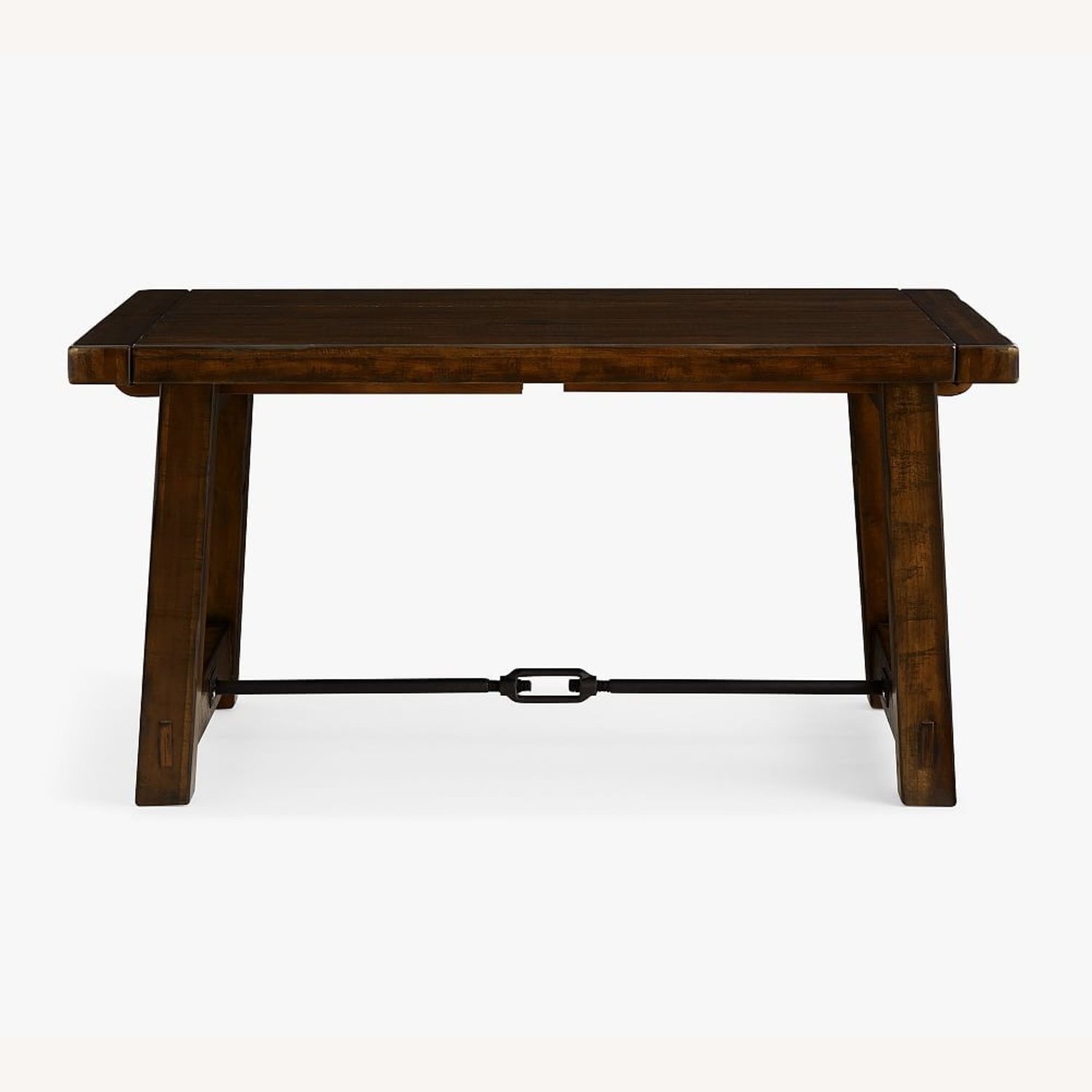 Expertly crafted of forged iron and from thick planks of meticulously weathered and distressed hardwood, poplar veneers and MDF. Due to the nature of planked wood, the table may have small spaces between the panels. MDF is an engineered wood that lends exceptional strength and ensures the product’s structural integrity over time. The use of veneers results in high-quality furniture that has elegant surfaces and consistent color tones that will not be subject to cracking. Finished in Reclaimed Pine by hand using our exclusive multi-step process; an innovative, exclusive process that makes each piece unique. Table features a metal turnbuckle tabletop support rod; 1 straight rod for 60" x 38" and 74" x 40"; 2 slanted rods for 86" x 42" and 108" x 42". Unique breadboard extensions hold drop-in leaves. Adjustable levelers to add stability on uneven floors. Contract Grade: Thoughtfully designed and expertly engineered to meet rigorous testing standards and best practices from select ANSI/BIFMA testing protocols. Imported. Care To protect finish, do not apply abrasives or household cleaners, dust with soft dry cloth. Always use coasters, pads cloth or felt to protect furniture surface. Wipe up spills immediately.