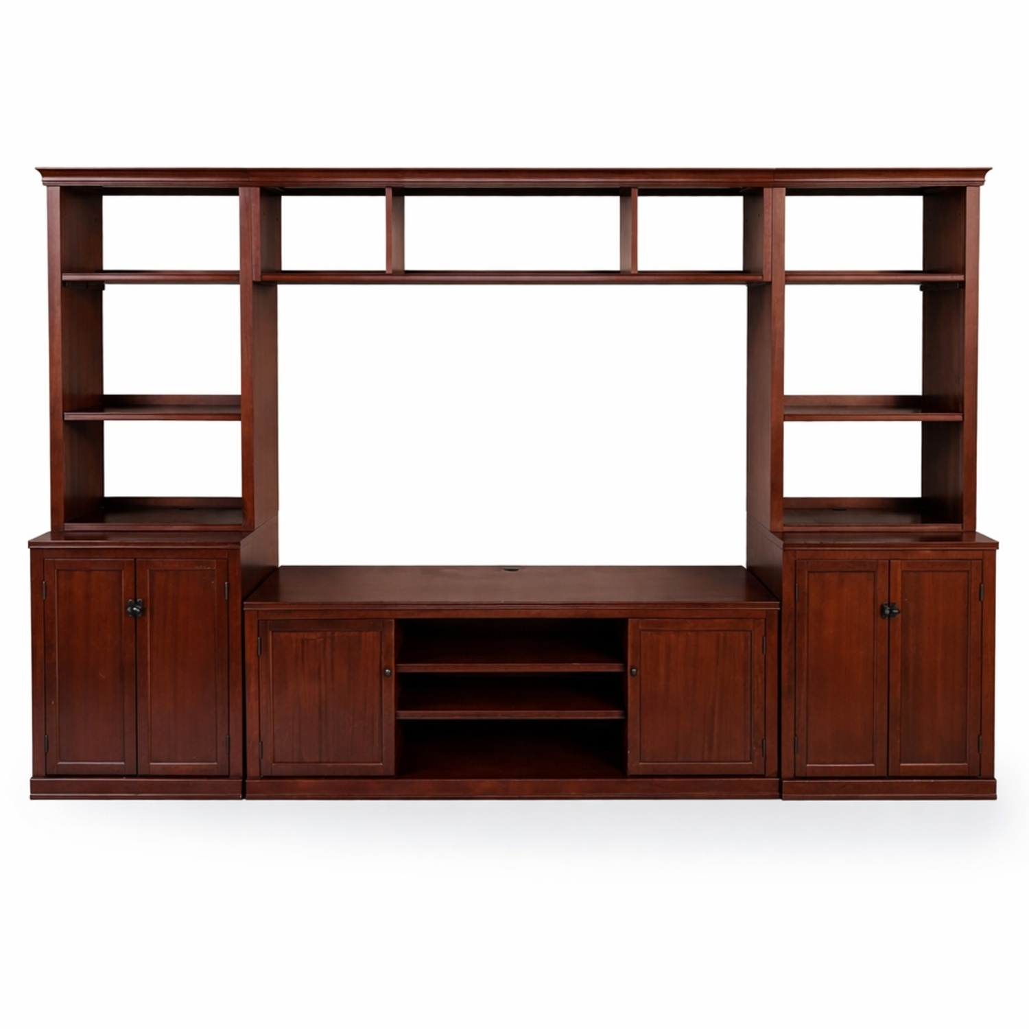 Seller's Notes:Large entertainment/media center with roomy shelves and cabinets. The two outside lower cabinets also have shelves on rollers along the bottom - they were made for DVDs, but obviously would also work for storing smaller books and games. You can store 2-3 rows of books in the lower cabinets easily. There are also plenty of hidden places in the backs of the shelves to snake cords if you'd like to rig it with a big sound system.
