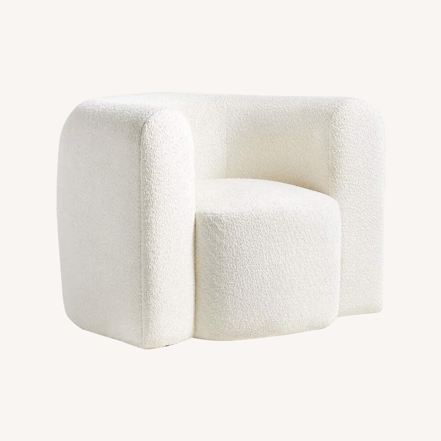 Hugger's sheltering silhouette flows seamlessly from arm to back to create a nook for nestling. Striking for its sculptural curves, the chair and a half offers a tight seat that strikes a comfortable balance between formal and lounge-y. Ours exclusively, the modern statement chair raises slightly on inset beyond the shadow line for a floating effect. The bouclé upholstery adds irresistible texture and a fun, casual vibe. Curated and crafted around the world, our first furniture and design collaboration with design star Leanne Ford brings her cool, effortless vibe home to you. Hugger Curved Boucle Chair and a Half by Leanne Ford 28.5"Hheight38"Wwidth36"DdepthMeasurements are in inches. Designed by Leanne Ford Engineered hardwood frame High-resiliency foam seat with sinuous coil springs Back cushioning is polyfoam wrapped in fiber Polyester upholstery Made in USA of Domestic and Imported Materials