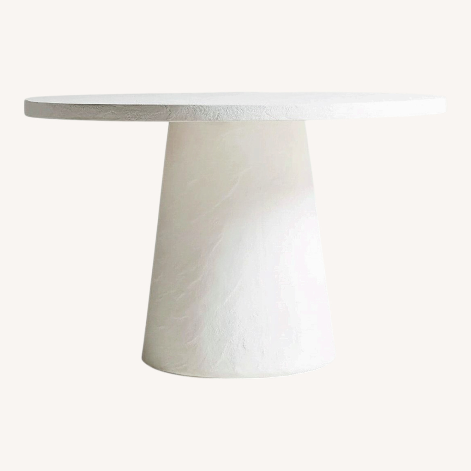 Seller's Notes:Willy distills the classic pedestal table down to its striking essentials in pure white. The white table's bold conical pedestal and simple round top are made with a plaster-like substance that looks like concrete but is lighter in weight and more easily fabricated into this dramatically simple shape. The Willy pedestal dining table is a Crate & Barrel exclusive.