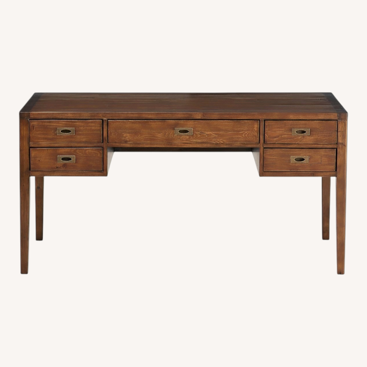 Seller's Notes:Morris reclaims pinewood pallets, expertly refinishing them to create this statement-making, campaign-style desk. Rustic refinement exudes from this polished piece, which is outfitted with metal inset pulls with an antiqued brass finish.