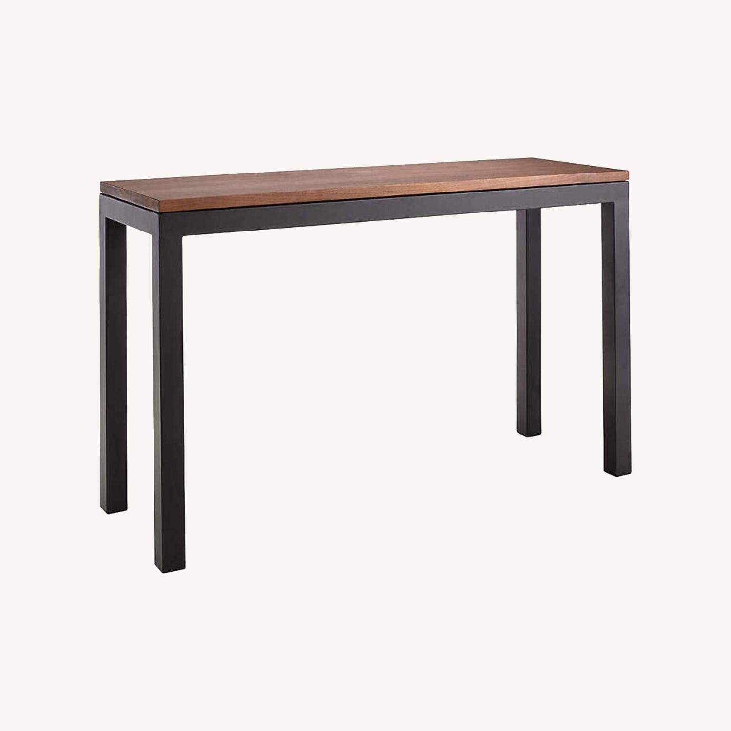 Seller's Notes:Crate & Barrel parsons refurbished teak high top table. Nice table made be crate and barrel using refurbished teak for the table top. It is a high top table perfect for 4 people.