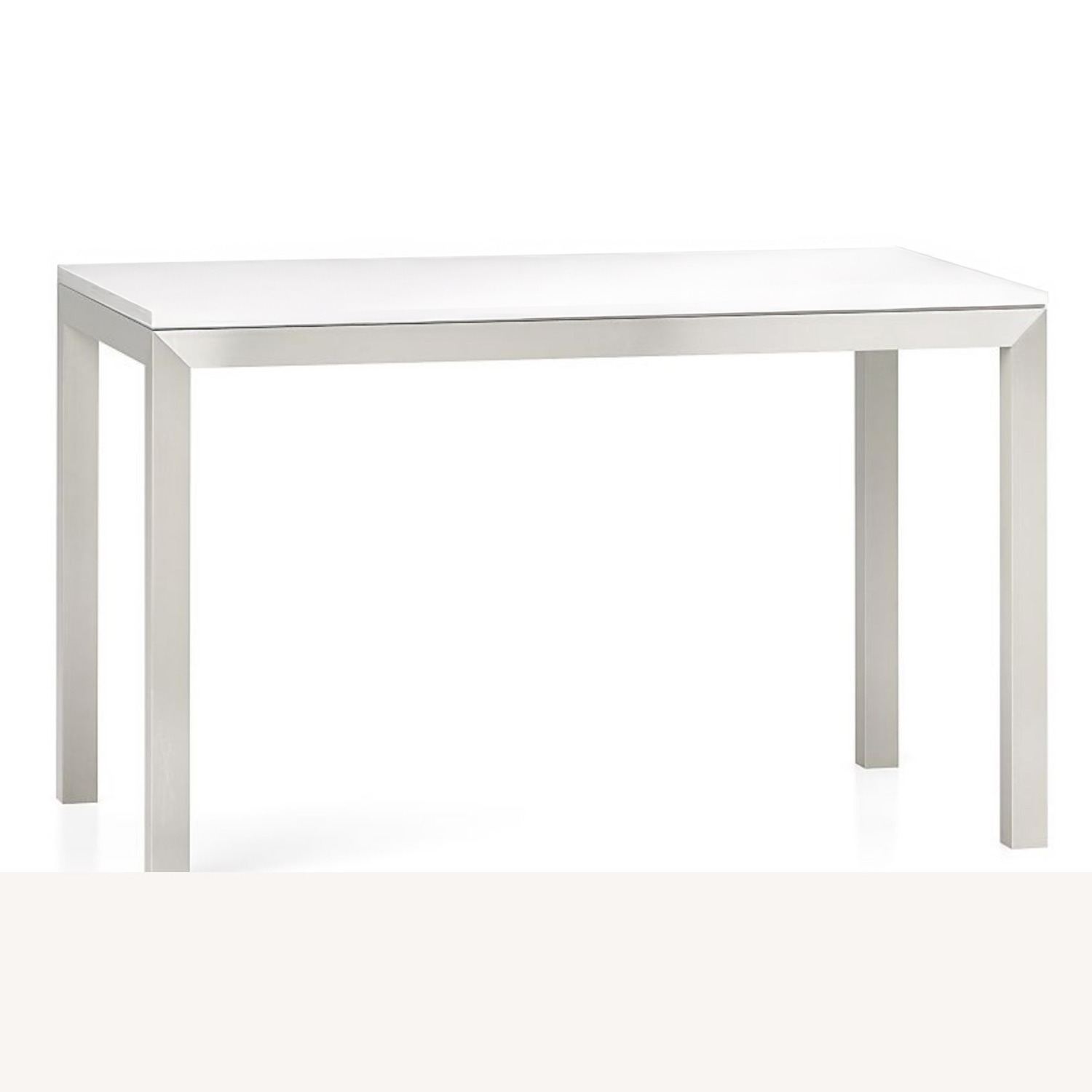 Seller's Notes:White laminate table (1" thick) atop a stainless steel frame with a soft, contemporary brushed finish that mimics mitered wood corners.