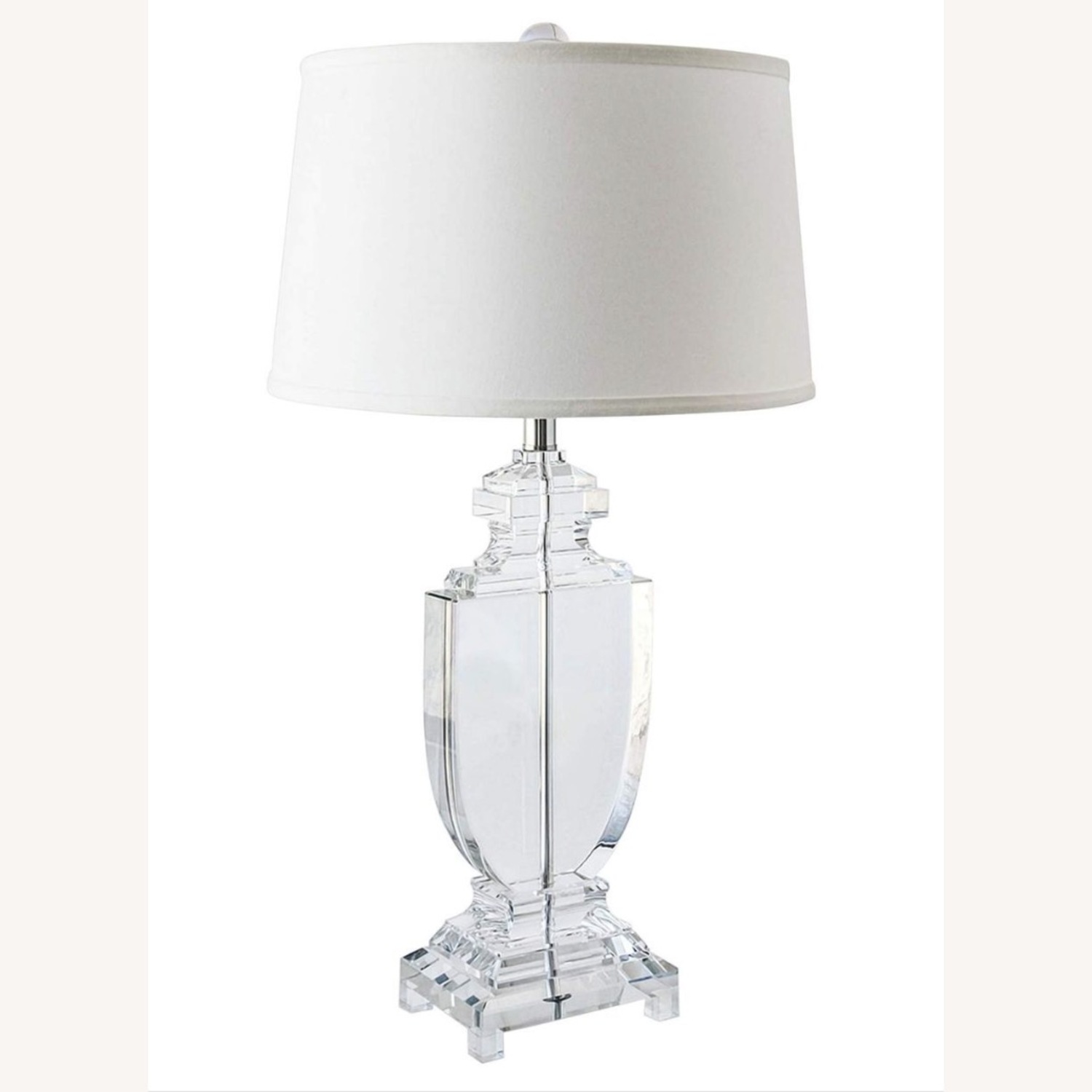 Seller's Notes:Carr crystal flat urn table lamp designed by Regina Andrew. Clear crystal glass construction and finish. Linen hardback shade. 8" harp saddle to swivel. Includes 8-foot long clear cord and plug.
