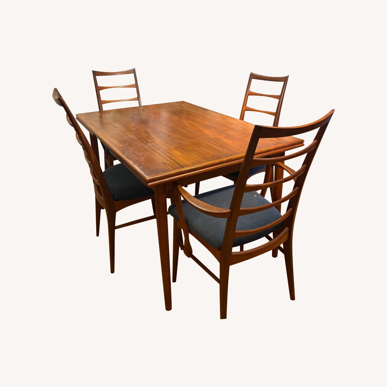 Seller's Notes:Purchased on my grandmother's world trip in Denmark in 1965. This dining room set has been with me since I was born. Table leaves add 18 inches to each side. Total width 85 inches. The 6 chairs that come with it were just reupholstered in 2023. This dining room set has been loved and used. I believe it is VSM Denmark. Sold as set 6 chairs and 1 table.