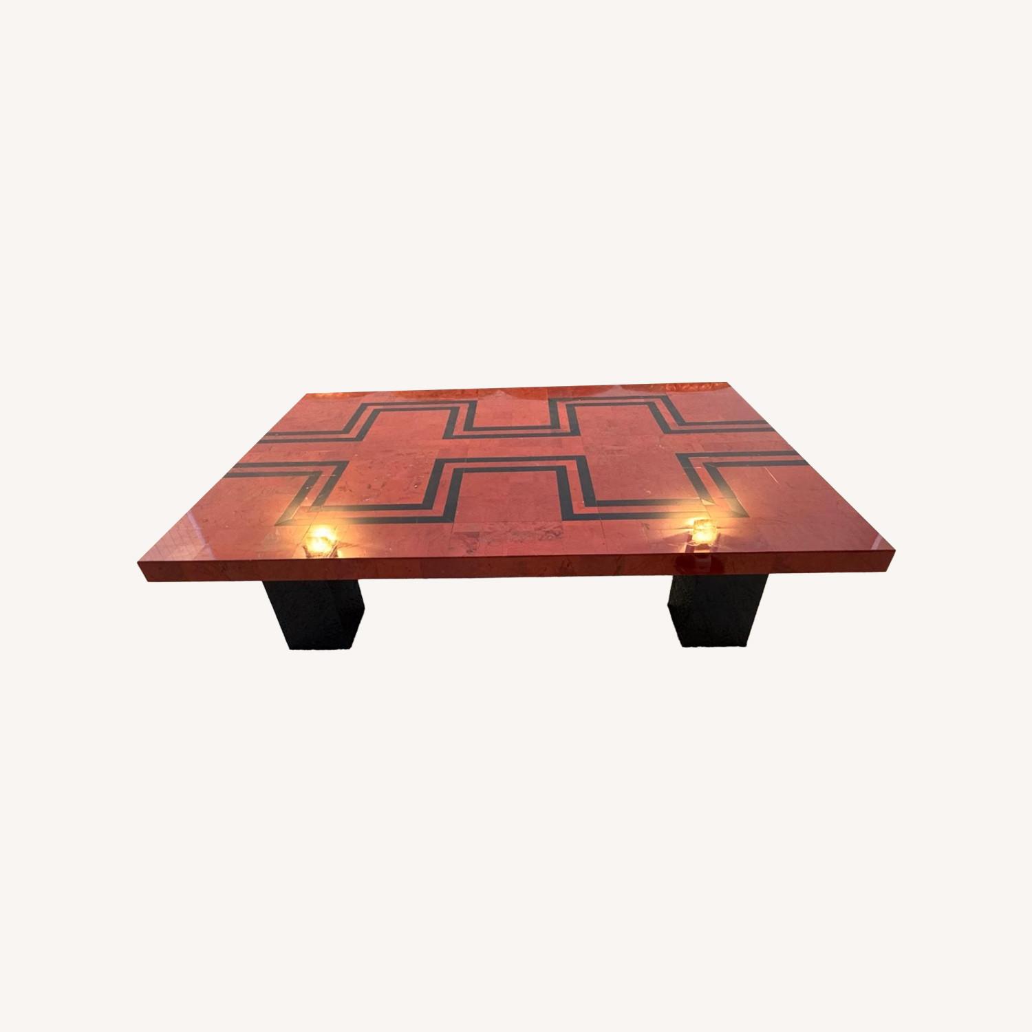 Seller's Notes:Georges Mathias Belgian Mid-Century Modern red lacquered coffee table with a black geometric inlay
