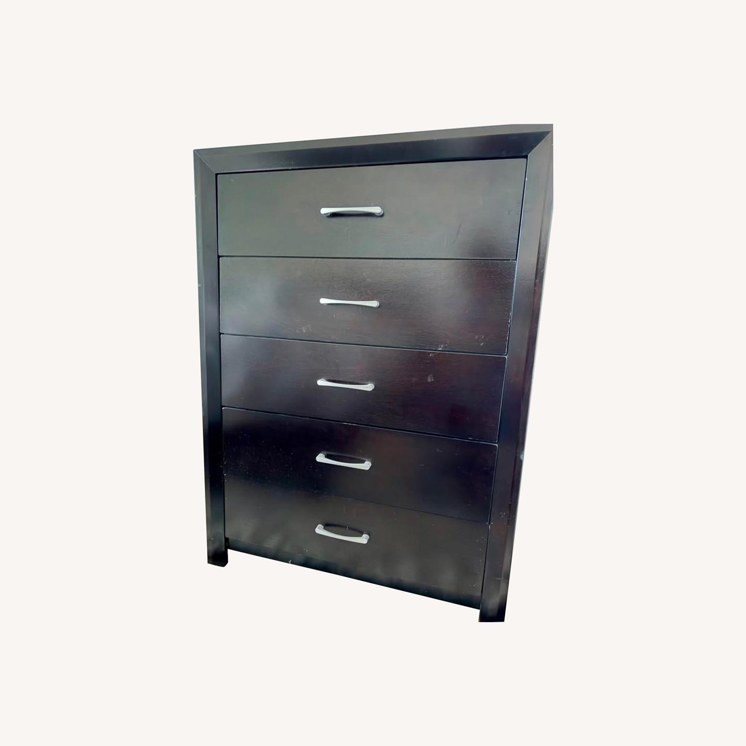 Seller's Notes:Solid wood 5‑drawer dresser – dark espresso finish. Sturdy, all drawers glide smoothly, and it offers tons of storage without taking up much floor space (35.5” W x 48” H x 15.5” D). Has cosmetic wear, including surface scratches and some edge chipping, but still structurally solid and perfect for a bedroom or guest room. Priced accordingly—great value if you want real wood instead of particleboard. Pickup only in Oakland. Comes from smoke‑free home.