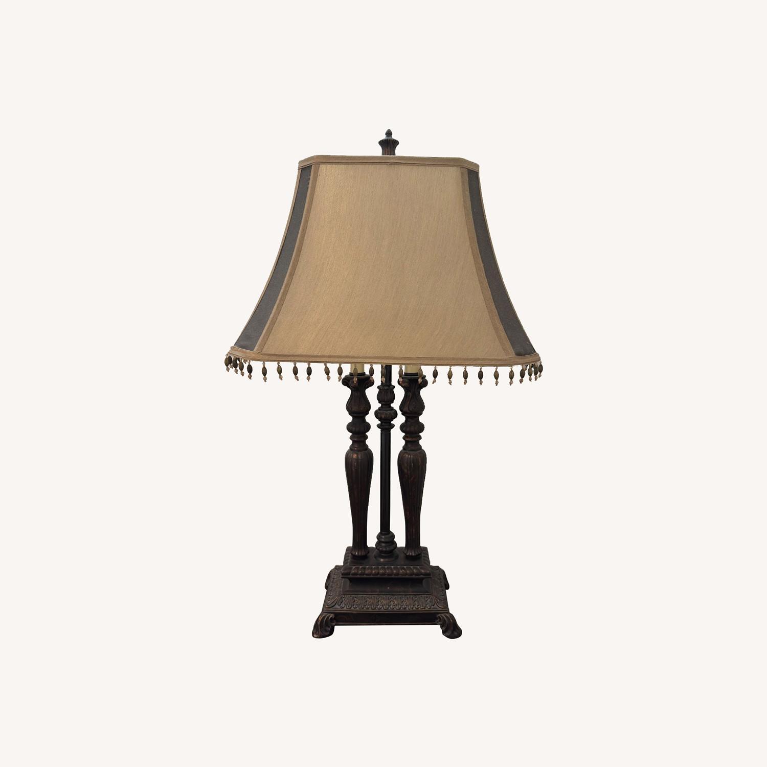 Seller's Notes:Beautiful night stand or table lamps. Comes as a set. In great condition. The picture with the lamp turned on is with one bulb. Each lamp allows you to installed two bulbs for brighter lighting.