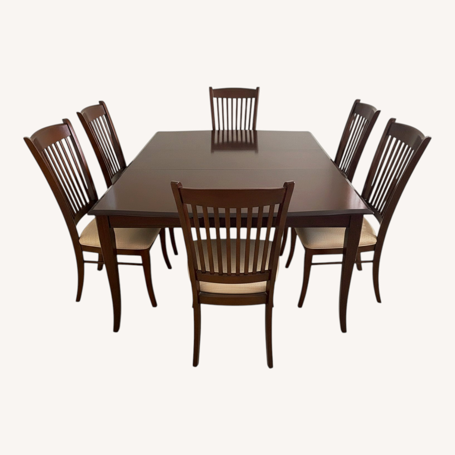 Seller's Notes:Beautiful, like new condition. 6 chairs (2 arm chairs, 4 non-arm chairs) One 12-inch leaf store under table.