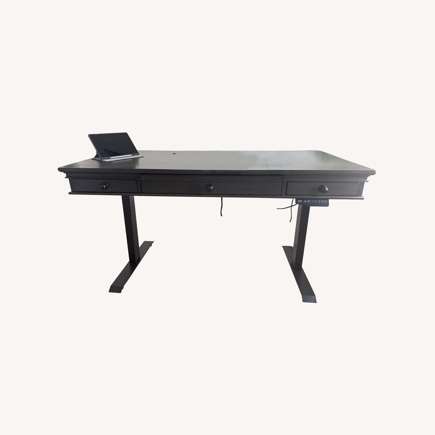 Seller's Notes:Motorized Height-Adjustable Office Desk – Dark Grey Wood (Purchased April 2025) Modern dark grey wood office desk with motorized height adjustment, allowing you to easily raise or lower the desk for sitting or standing. Features three built-in drawers for storage and integrated power outlets suitable for charging a mobile phone, laptop, and connecting a monitor. In excellent condition and ideal for a home office or workspace.
