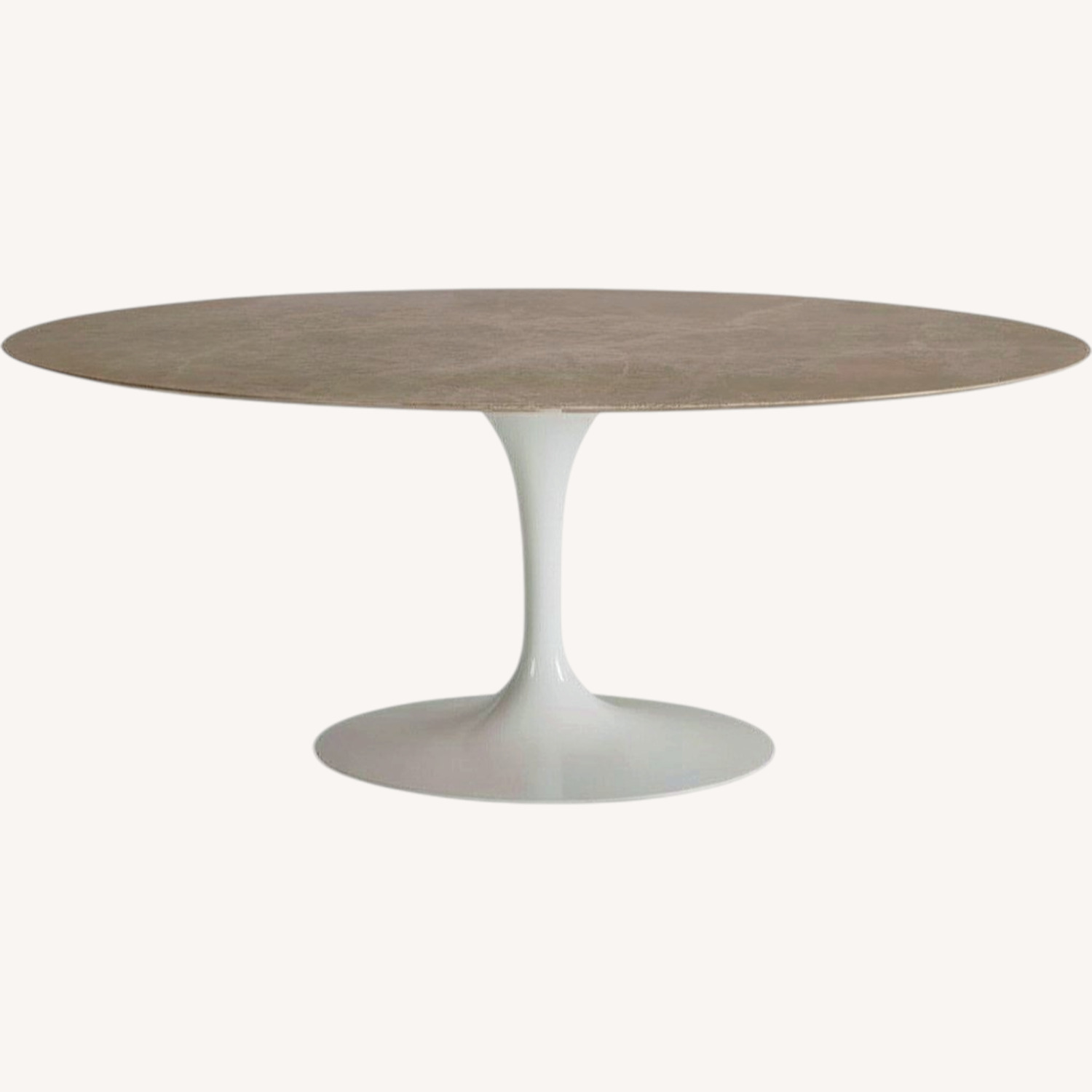 Seller's Notes:Architect Eero Saarinen was a genius at creating expressive sculptural forms. From his TWA Terminal (now the TWA Hotel) at New York’s JFK Airport to the Gateway Arch in St. Louis to his Pedestal Table (1956), there’s a magic in everything he created. The Saarinen Dining Table, as he explained in a 1956 Time magazine cover story, was designed to “clear up the slum of legs in the U.S. home.” Later that year, he completed the Pedestal Table, which stands on a gracefully shaped cast-aluminum base. This is the authentic Pedestal Table by Knoll. It’s stamped with the KnollStudio logo and Eero Saarinen’s signature. Tabletop made in Italy or U.S.A., depending on material.