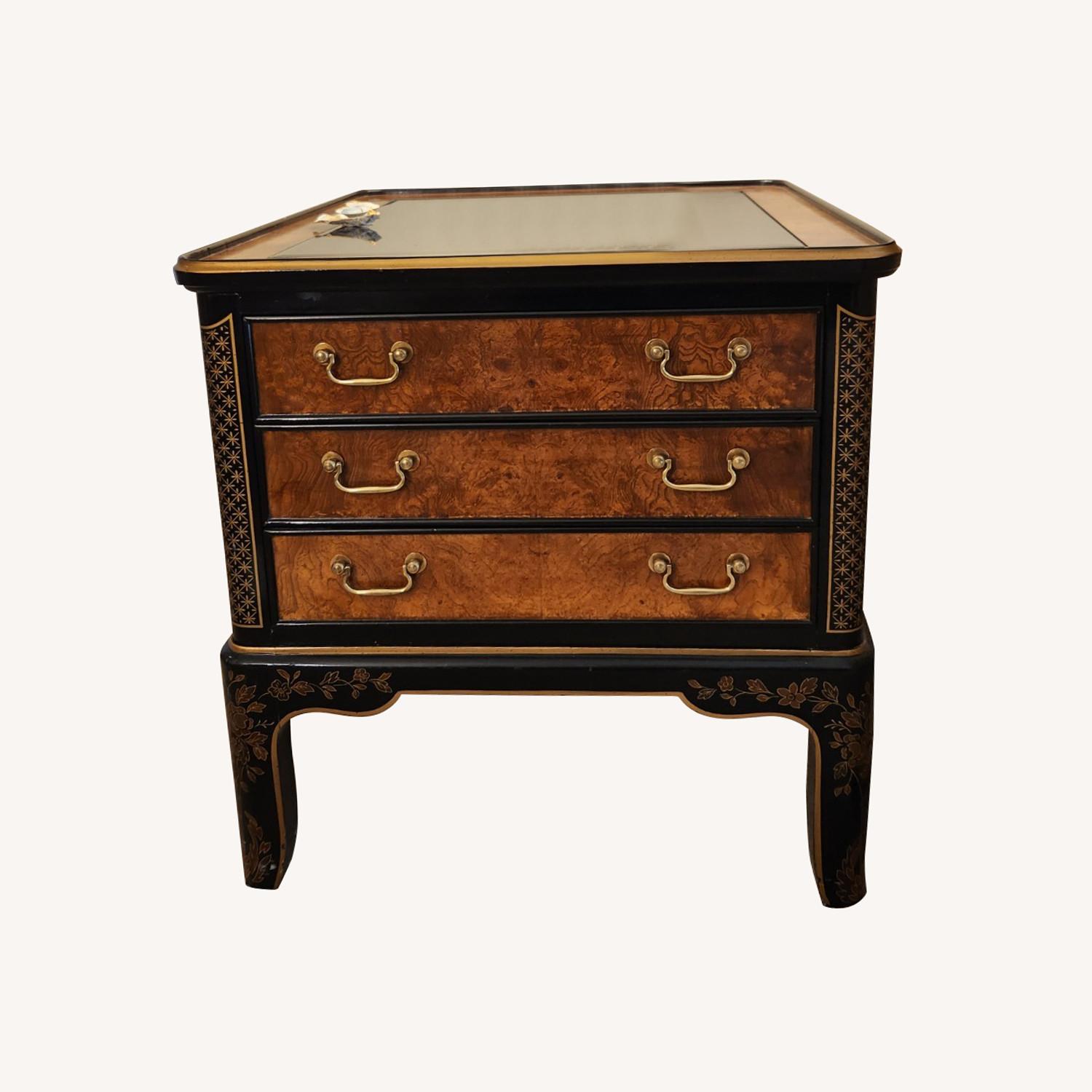 Seller's Notes:The Drexel Heritage 3-Drawer “Et Cetera” side table is a high-quality vintage piece which features a Chinoiserie style. Looks great with Drexel display cabinet shown on aptdeco.com. Style: Asian-inspired, Chinoiserie style, it includes hand-painted and gold-painted details. Materials: Primarily constructed of wood, finished with a black lacquer and accented with patterned burlwood drawer fronts. This table also features a smoked beveled glass top. Design: The table has three dovetailed drawers with brass hardware for storage. Dimensions: 26”W x 24”D x 23.5”H