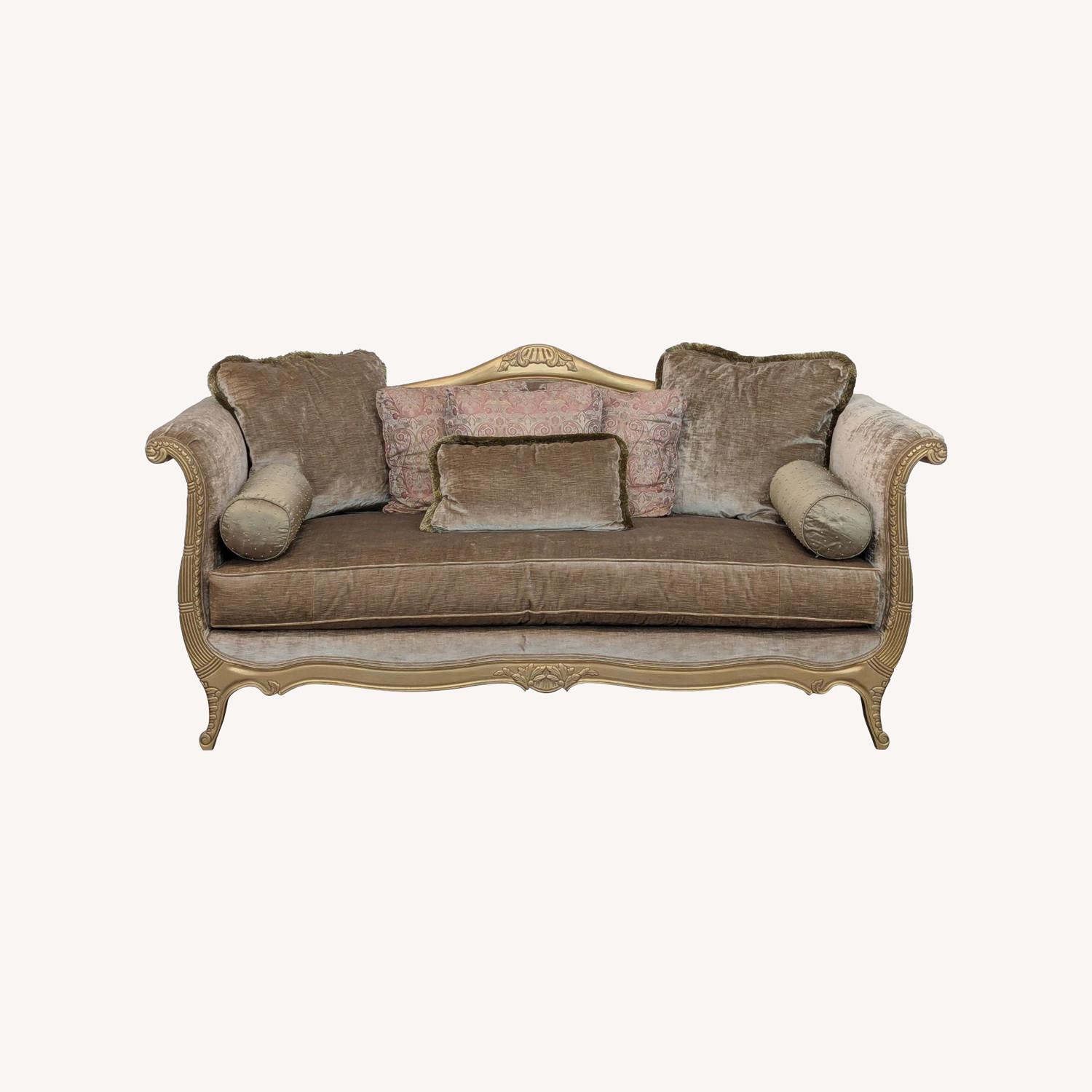 Seller's Notes:Features wood frame with carved detailing, velvet upholstery and decorative accent pillows.