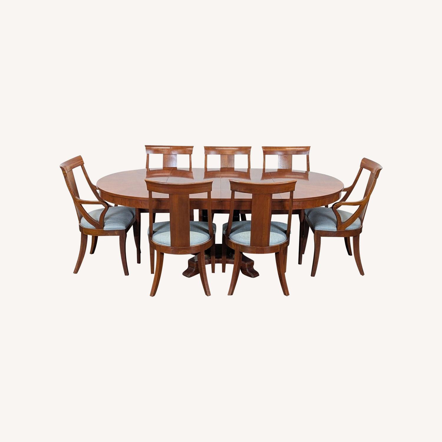 Seller's Notes:This elegant Ethan Allen dining set features a sturdy wooden table with an extendable design, perfect for family meals or gatherings. The set includes seven matching chairs with comfortable upholstered seats. Its timeless style and durable construction make it a great addition to any dining room.