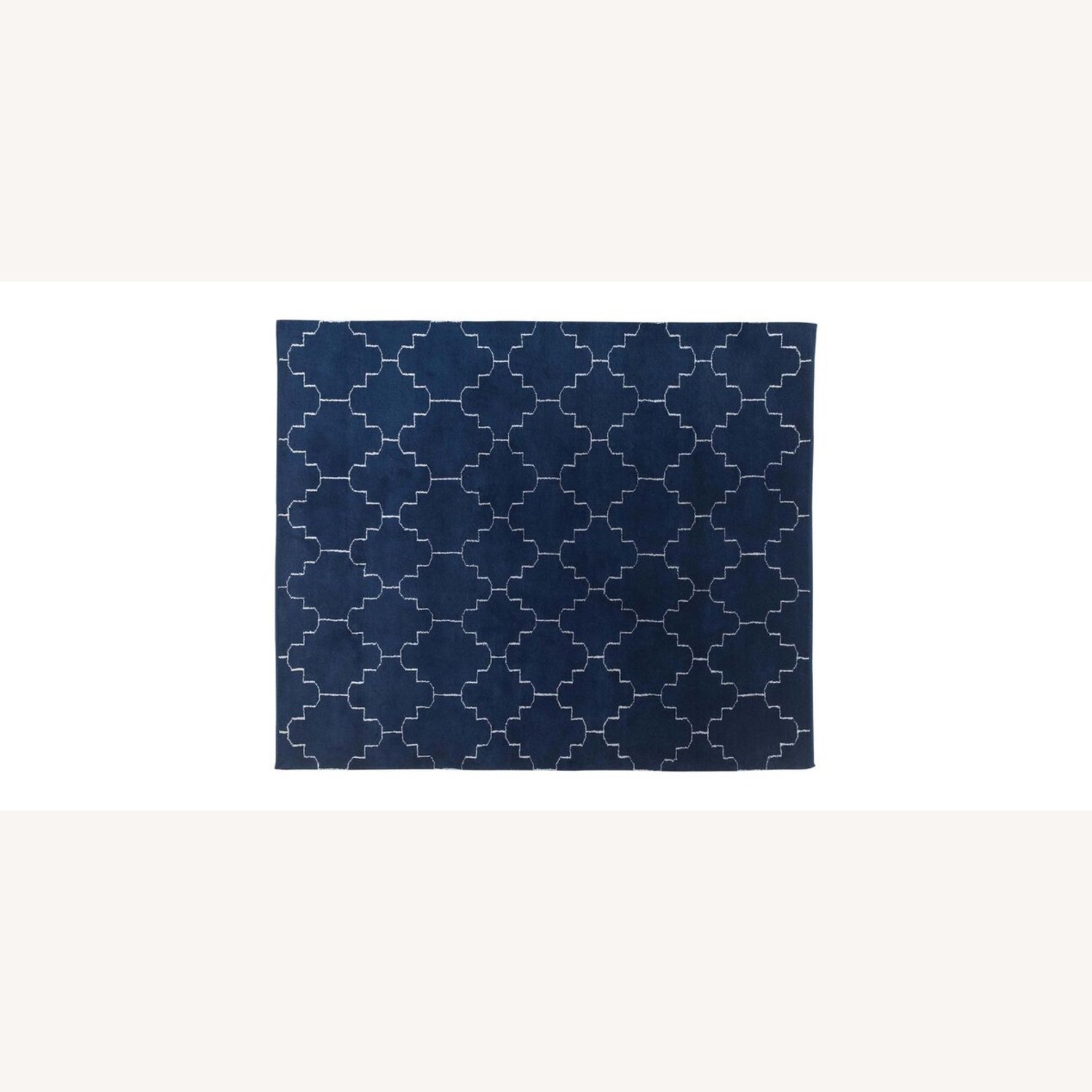 Seller's Notes:Large 11’ x 14’ geometric navy blue rug from Ethan Allen. Tulu Tracery Rug in blue with white detailing.