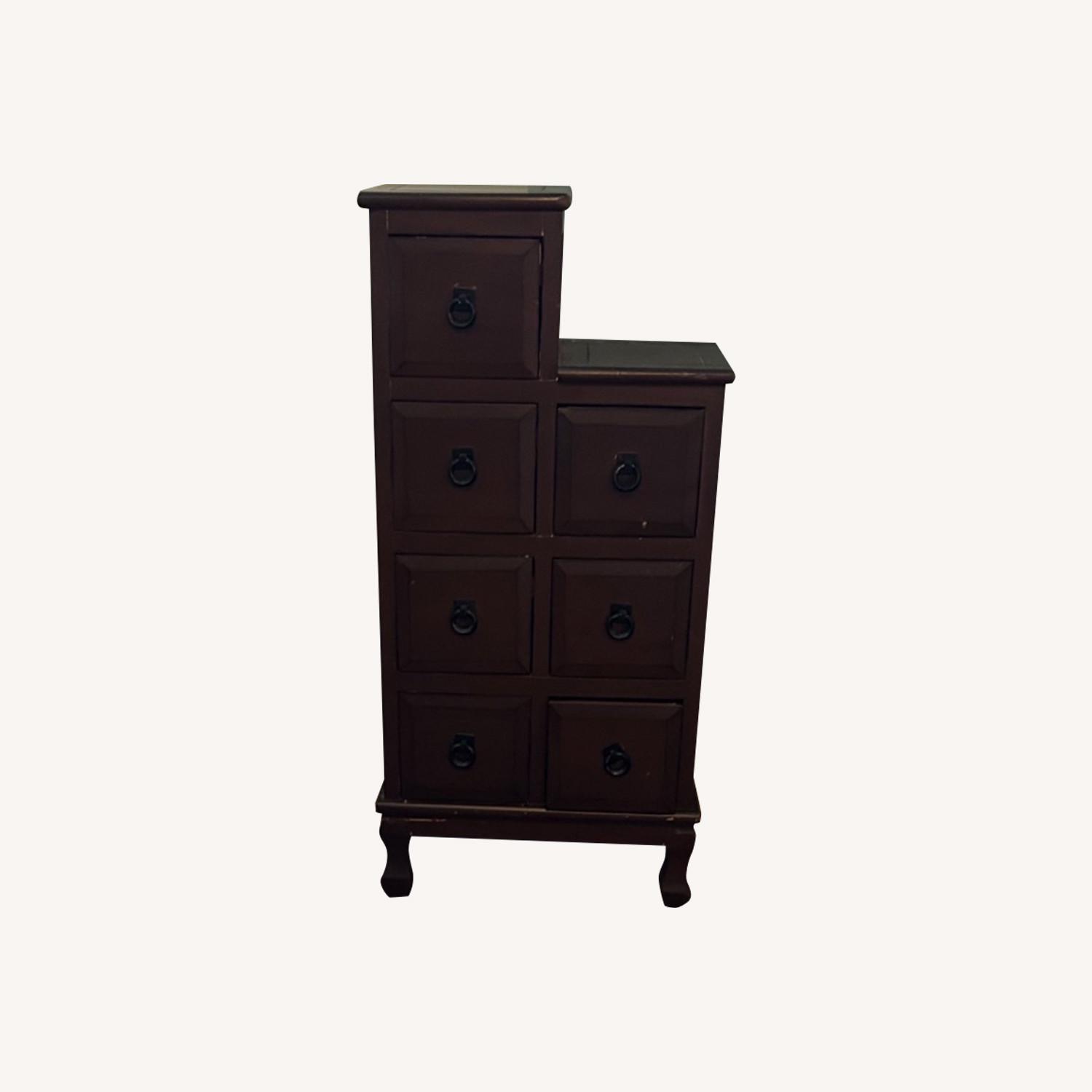 Seller's Notes:This sturdy retro looking cabinet is a perfect addition to any foyer, corner or side piece to your dining room table. The hue of brown compliments any color, especially light and dark woods. It showcases beautifully on a wall on its own, or next to anything preferred. Additionally, it houses 7 draws that are great to hold an abundance of household items, especially linens, silverware, candles, or whatever your heart desires. This shelf can be utilized in every room of your home and will help keep you organized.