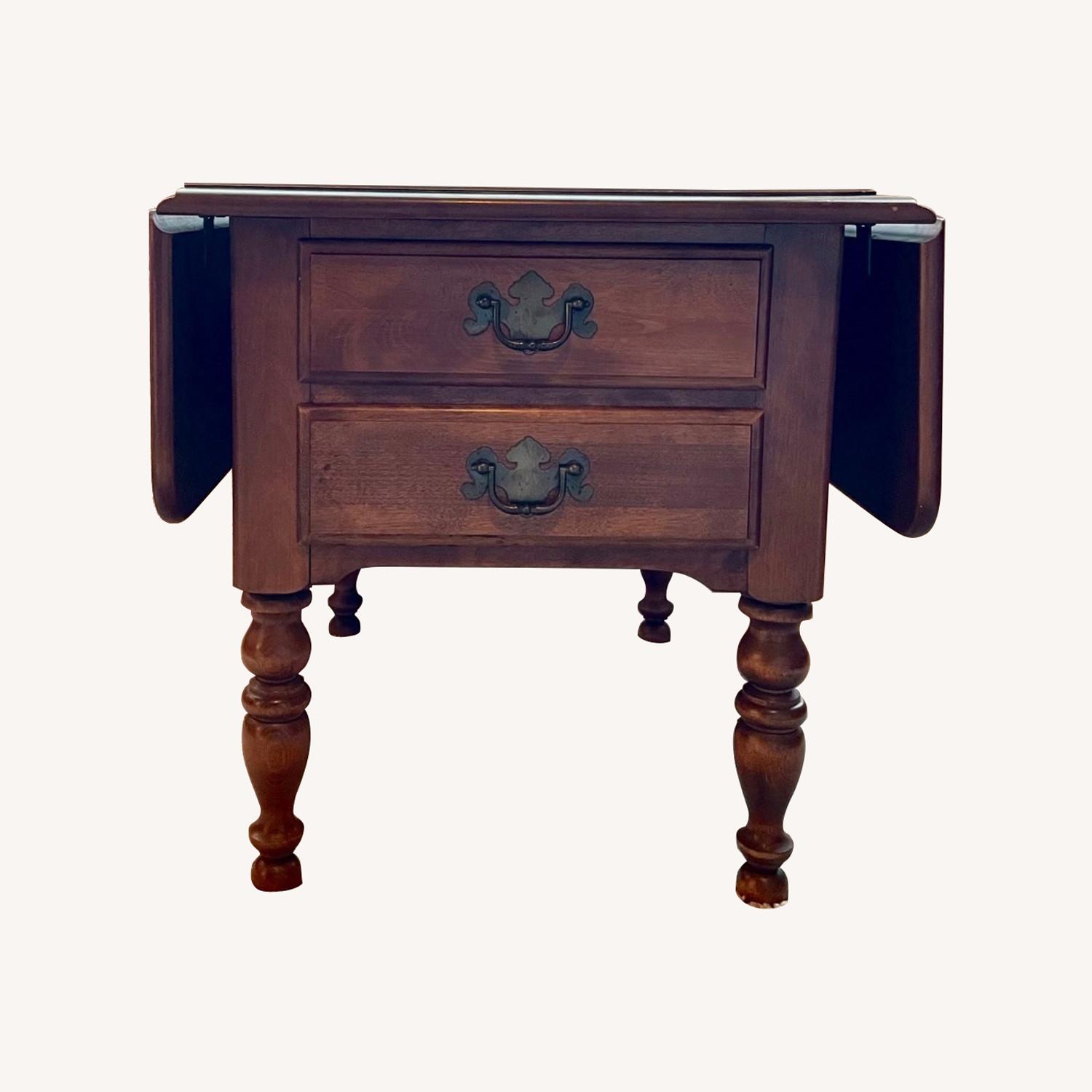 Seller's Notes:Ethan Allen Nutmeg Maple Dropleaf Side Table Side table is very sturdy and in great condition. Made of solid maple wood. The sides will fold down. The hardware looks a little rusted since this is an older piece. Brand name can be found inside the drawer. - full width of table: 36” - folded width: 20”