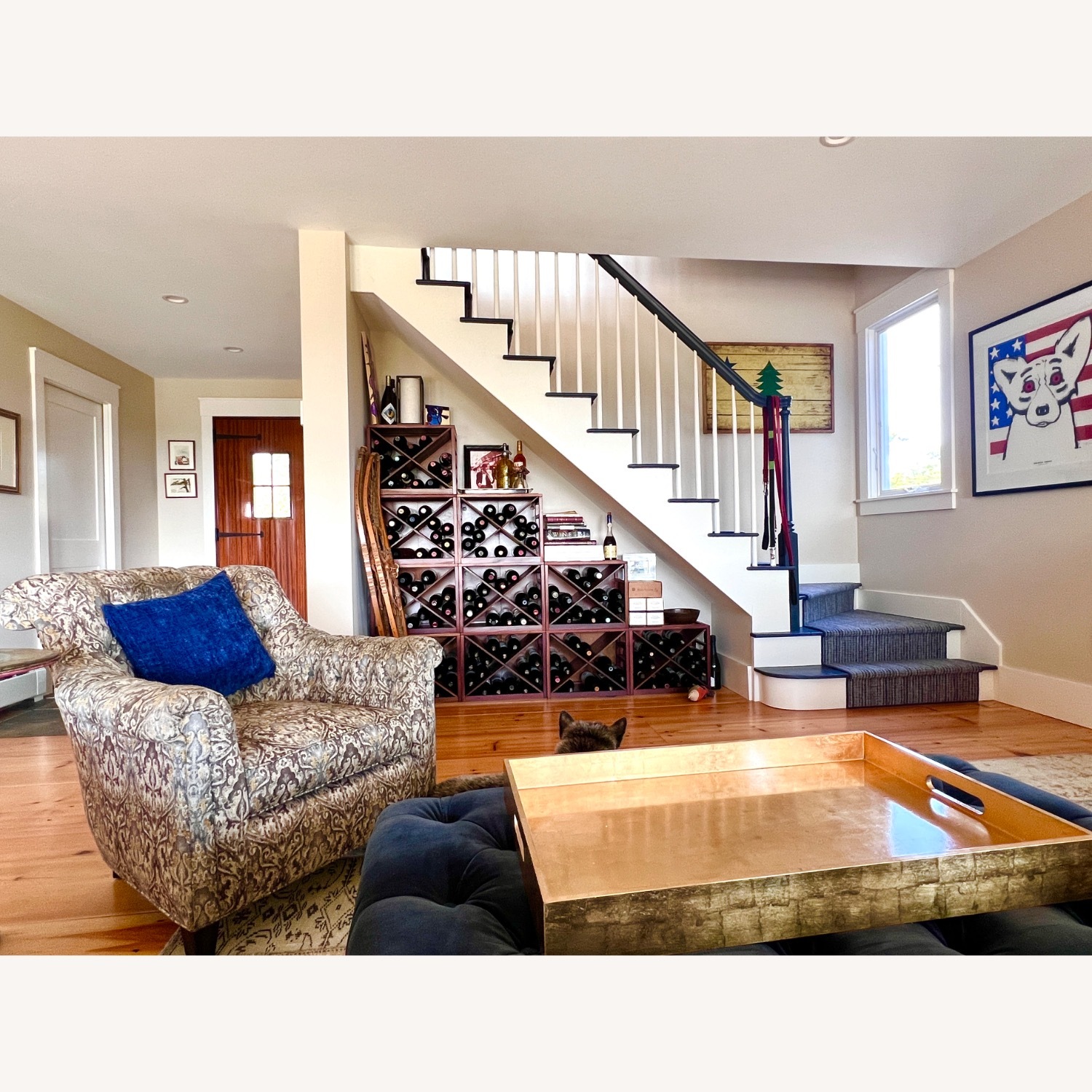 Seller's Notes:Chairs made by Arhaus. We are original owner/buyers. We are remodeling/refurnishing. At the neck there is some ordinary use staining accumulated over the years. You will see in the photo an accompanying ottoman in blue velvet, and an American Empire period sofa. These chairs have been meticulously cared for. These chairs have been exposed to dogs, but NOT cats. I am unable to check the "exposed to dogs" without also checking cats.