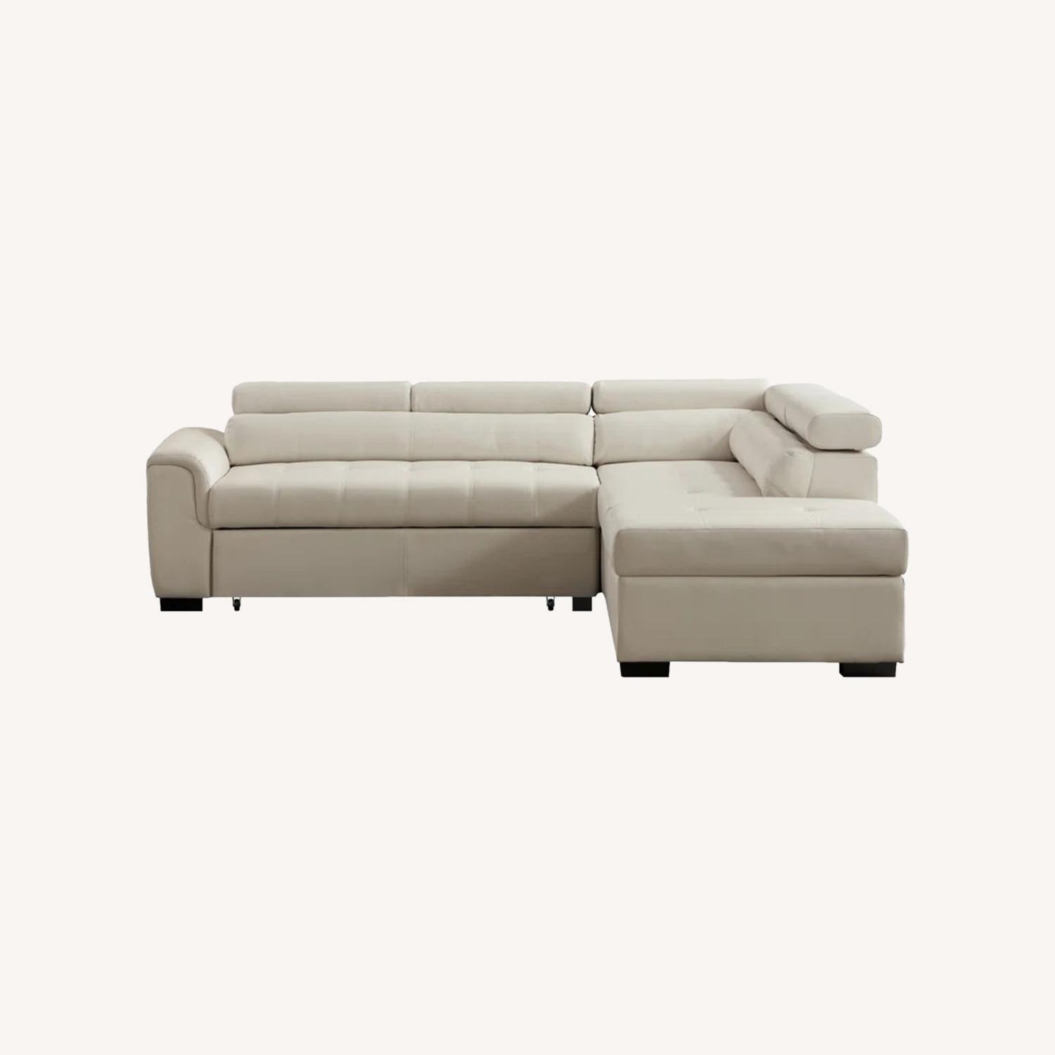 This large, l-shaped sectional features a right-hand facing corner design with a pull-out bed and storage ottoman, making it a spacious spot for friends and overnight guests. Crafted with a solid and engineered wood frame on block feet in a dark finish, and upholstered in faux leather, the sinuous spring suspension, flip-up headrests, and tufted cushions offer you luxury surroundings.