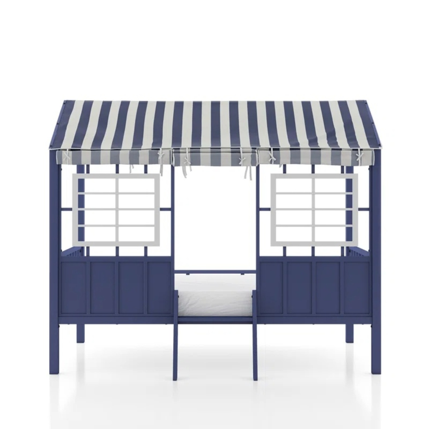 You remember how much fun you used to have - the thrill of not quite knowing what you can build out of blankets, cushions and pillows as you create your own secret place, no adults allowed! Give your child the joy of their own special place every night with the Rowan Kids' Twin Loft Bed. Featuring a sturdy white metal bed frame and soft polyester fabric with silk-print stripes, this loft bed for kids is the spot your little one will want to do everything - from playing house with their friends to dreaming day or night. The fabric curtains and door of the loft bed can be rolled and tied up and out of the way or let them loose when secret kid meetings are in progress. The low loft bed features guardrails and a fixed ladder to ensure safety and fits a standard twin size mattress, sold separately. Children must be at least 4 years old to use the top bunk.