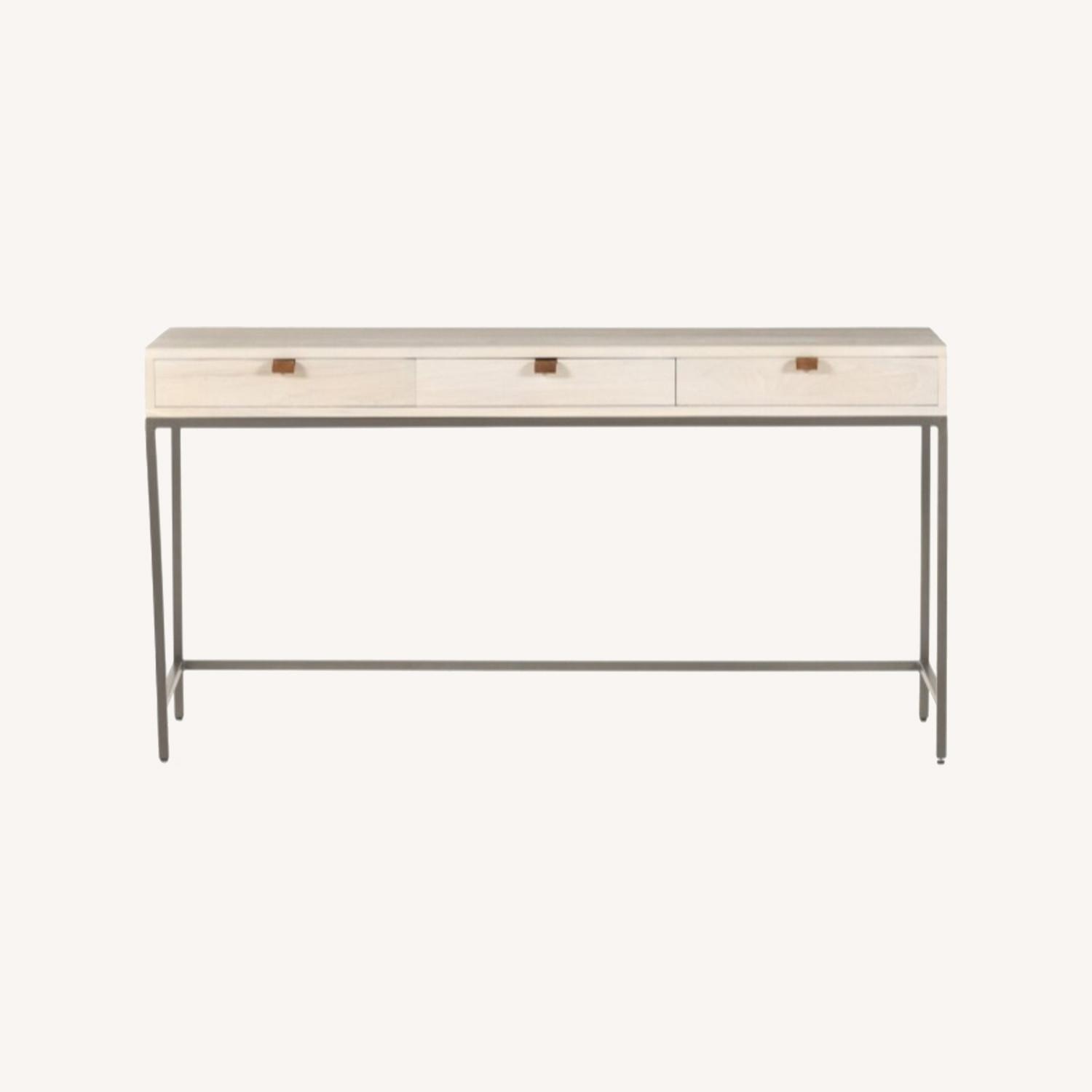 Seller's Notes:Inspired by clean midcentury design, solid poplar and raw iron fuse for style and storage alike, offering three spacious drawers, with a fully finished back plus metal-secured leather pulls for an element of surprise. Great solo or paired with matching corner desk, file cabinet or credenza. As a disclaimer there are stains/discolorations on the desk.