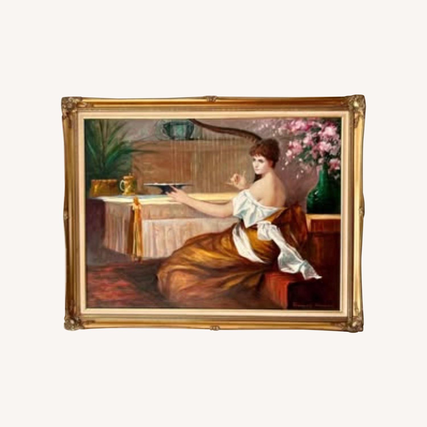Seller's Notes:Francois Boudin Oil Painting on Canvas 30” x 40” Elegant Portrait - Young Lady Playing The Harp Signed Beautiful Baroque frame 45 1/2”x 35 1/2”