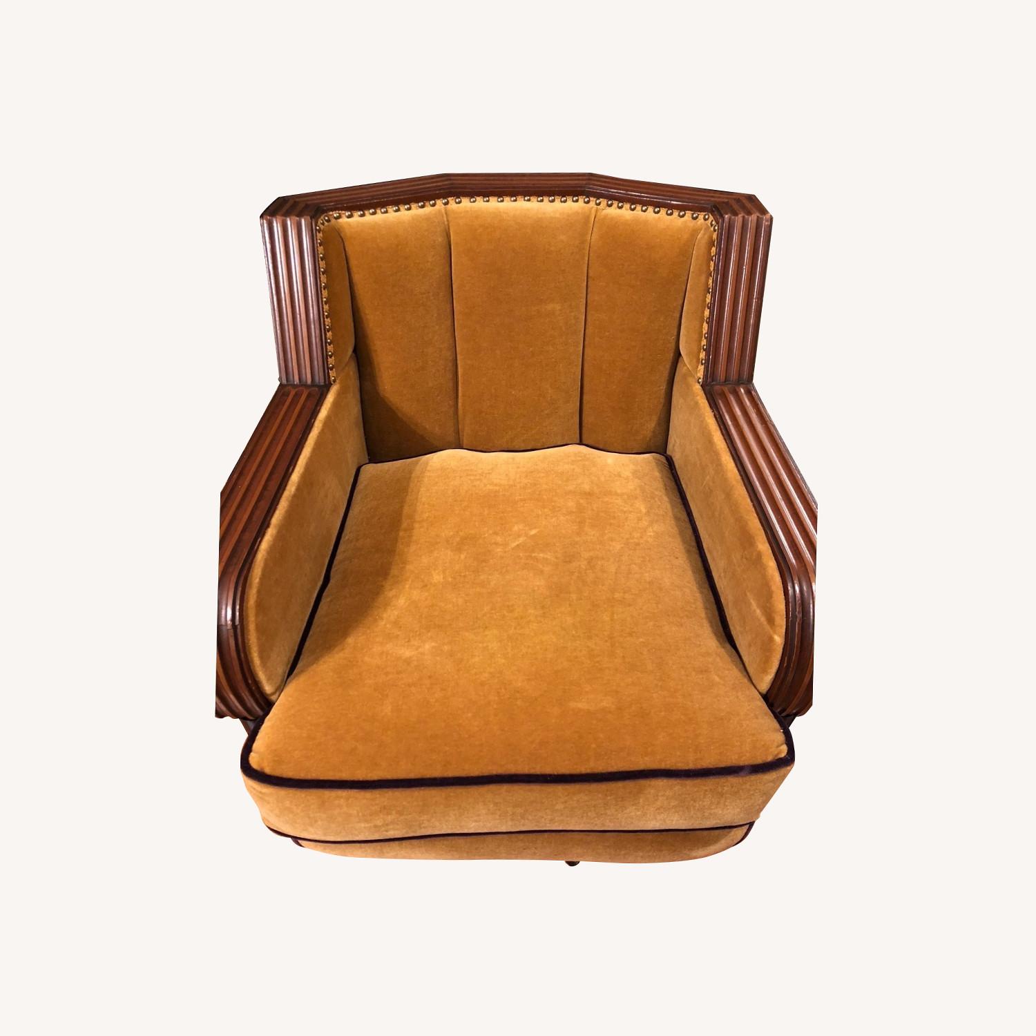 Seller's Notes:French Art Deco Charming comfortable club chair is in Great condition Fabric is gold tone wool mohair with purple piping - extra fabric included from upholsterer Baker lite inserts below arm rest make this chair unique Upholstered in 2018 to match original upholstery & fabric