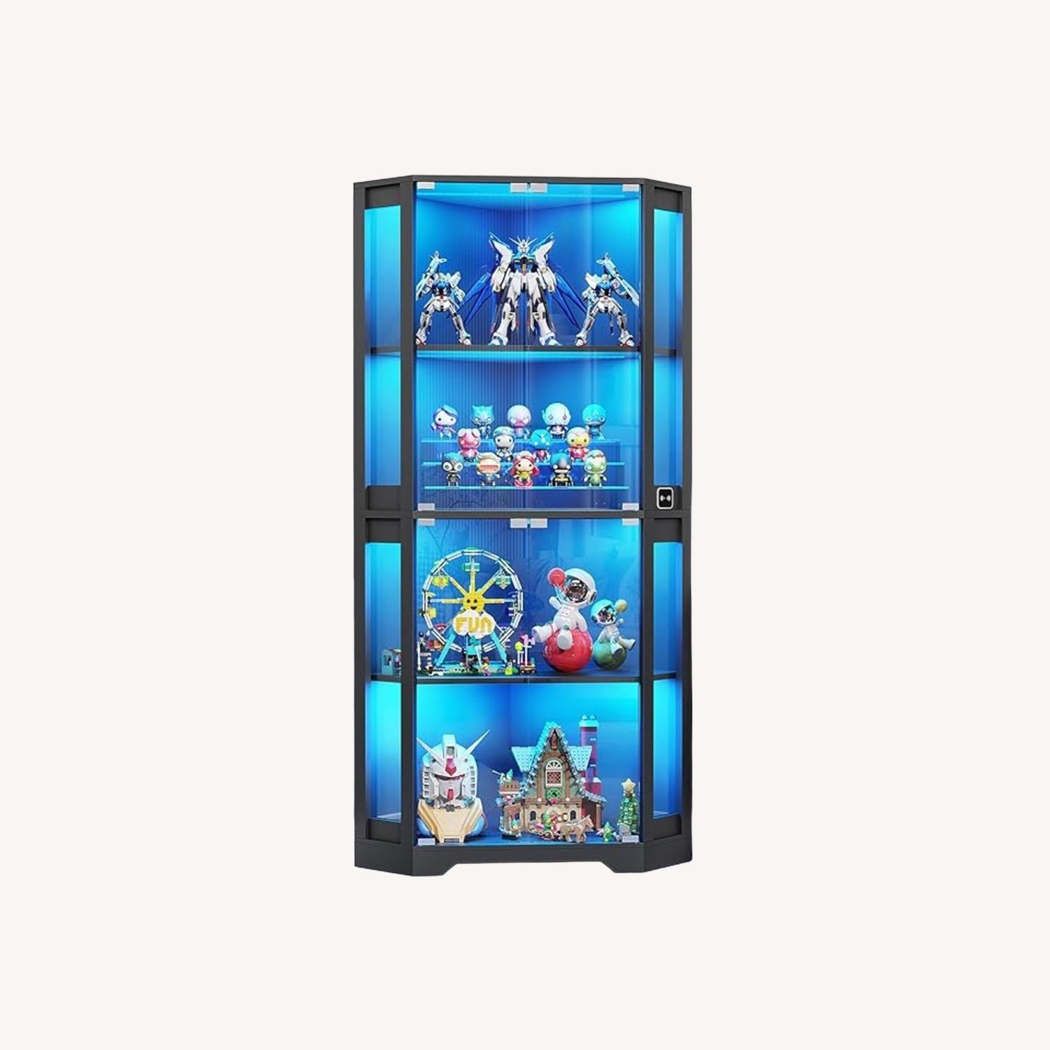 Seller's Notes:Brand new unopened display shelf made of glass. Still in the box! It has LED lights that can be programmed to glow different colors. The shelf doors are tap to open. It is meant to be set up in the corner of a room. Bought in August 2025, unopened and still NEW!