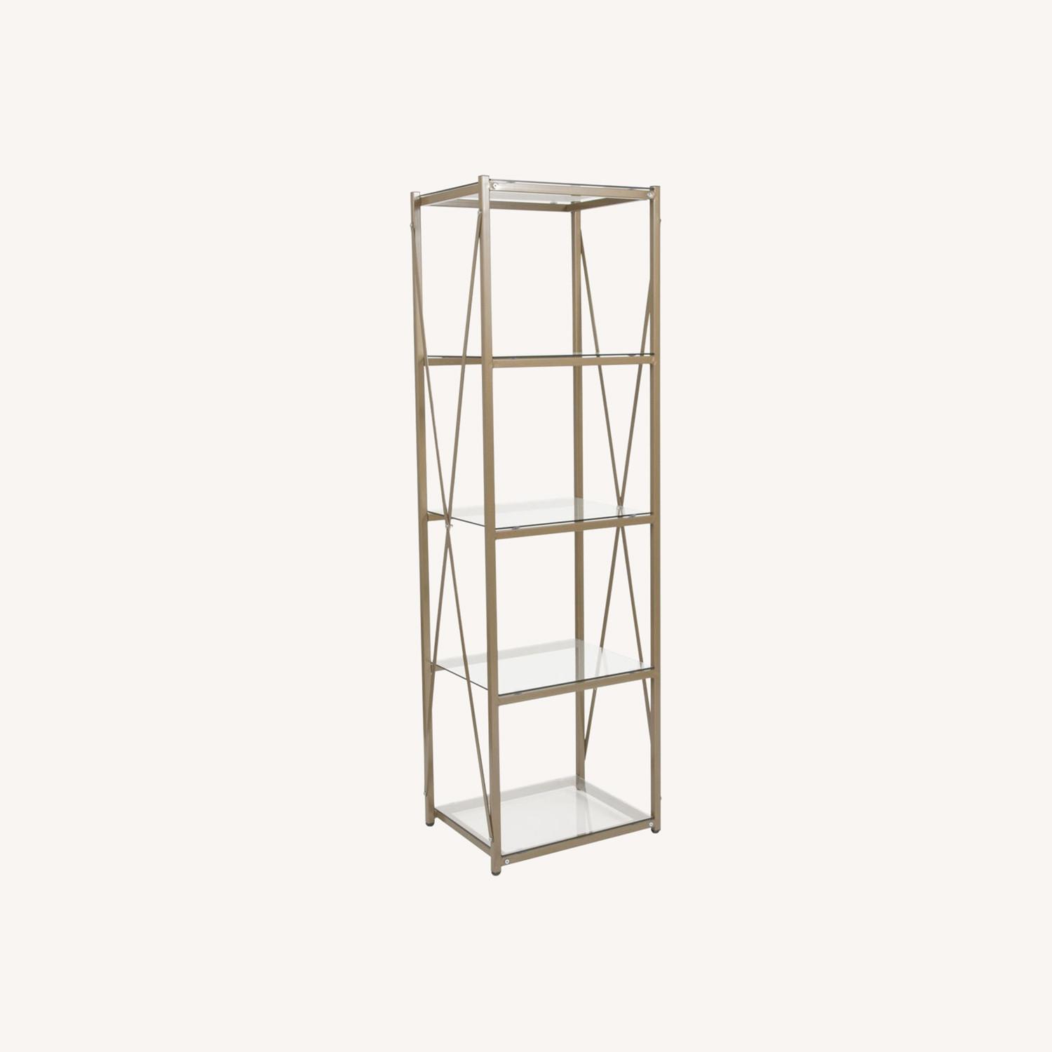 Display your decorative items, and photos on this stylish shelving unit. Clear tempered glass shelves will brighten up your space. The designer cross frame enhances the beauty. This versatile piece can be used anywhere in the home to meet all of your display needs.