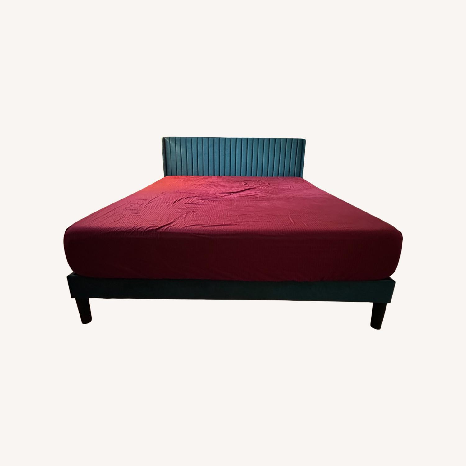 Seller's Notes:Selling my king-size luxury upholstered bed frame like-new condition. Purchased less than 2 years ago and very lightly used in a clean, smoke-free home. Bed is cushioned in a forest green color and the bed is all dark wood.