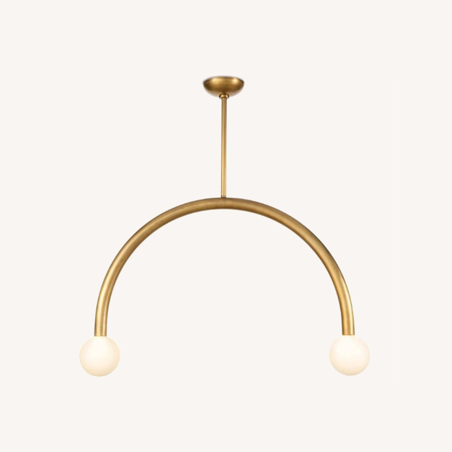 Seller's Notes:The Happy Pendant is a unique mix of modern and playful. Happy's simple, symmetrical charm creates uplifting illumination perfect for an entryway, kitchen or living space. The pendant's metal frame (brass) and contrasting matte white glass globes create an elevated take on a playful shape. Used for 6 months and movers packed up in box. Turns out we no longer need it. In perfect condition.