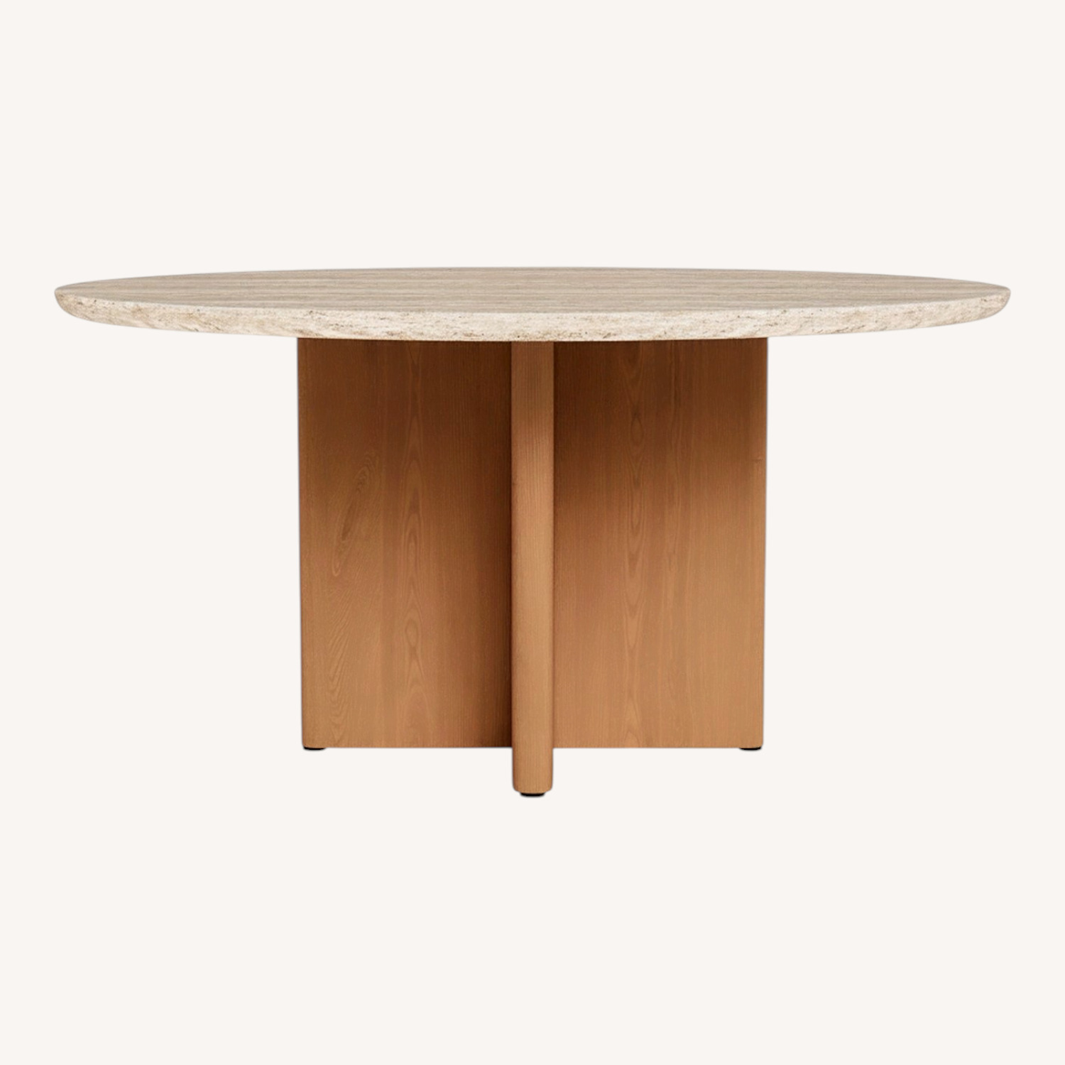 Seller's Notes:Brand New Harbour Outdoor teak & travertine round dining table. 60" round sits 6 people comfortably.