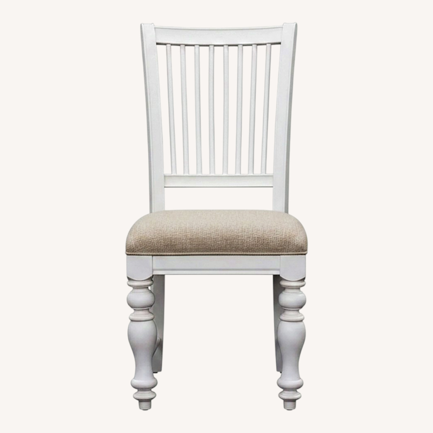 Seller's Notes:Pair of Dining Chairs – Upholstered Seat, White Wood Frame (Priced to Sell) Comfortable and sturdy dining chair with a neutral fabric seat and white wooden frame. Classic style that works with farmhouse, coastal, or modern decor. 40” H x 18.5” W x 23.5” D Upholstered seat (beige/tan fabric) Solid wood frame Lightweight and easy to move Condition: Good overall, with a visible stain or watermark on the seat (priced accordingly) easy to cover. Great as a dining chair, desk chair, or extra seating.