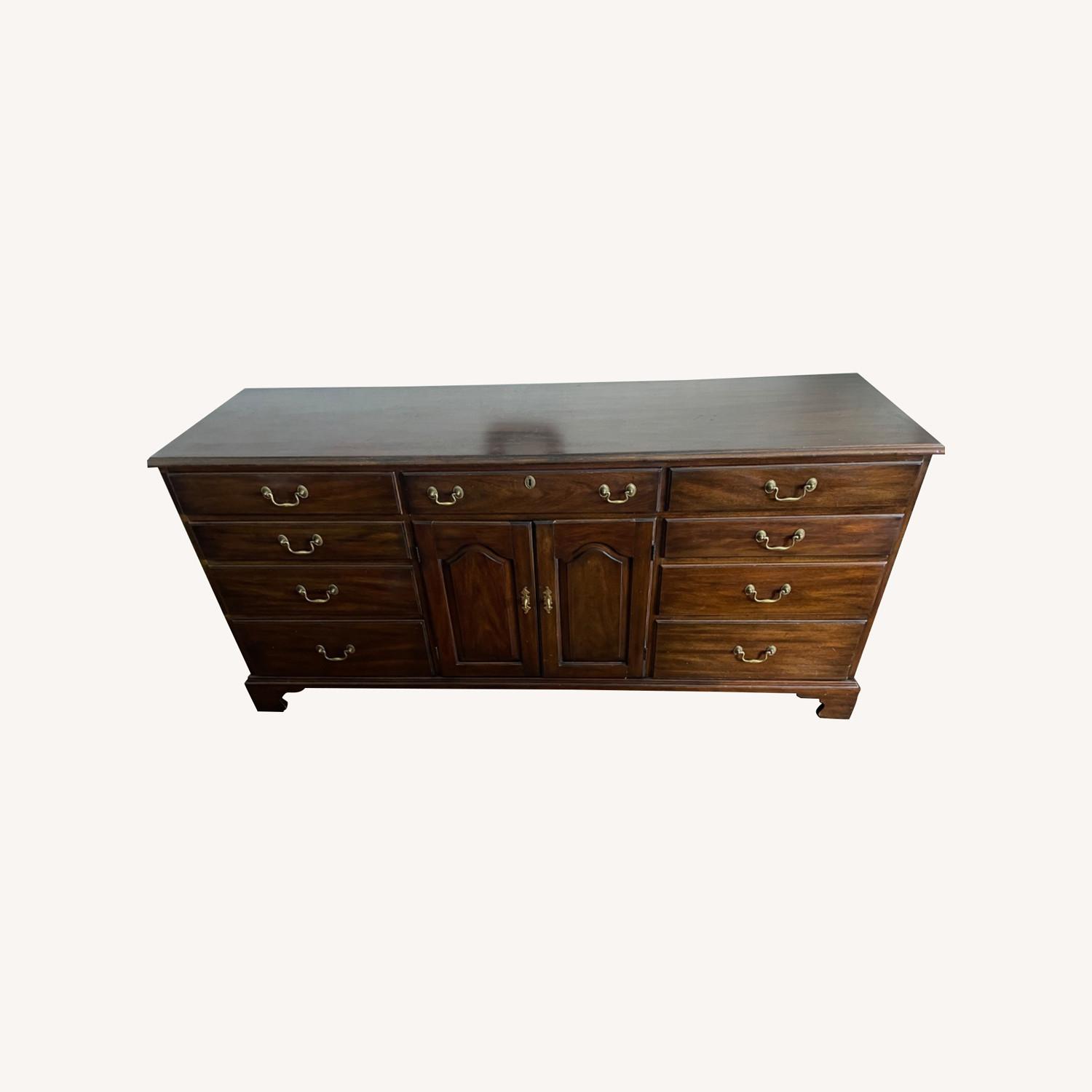 Seller's Notes:The Henkel Harris Vintage Cherry Triple Dresser is a stunning piece of traditional furniture from the 1960s, made from high-quality cherry wood and brass materials. This antique dresser features a classic Chippendale style, with intricate details and craftsmanship that reflect its originality and timeless appeal. With 9 drawers and a spacious design, this dresser offers ample storage and display space for your vintage clothing and accessories. Made in the United States of America by the reputable brand Henkel Harris, this dresser is a rare find for collectors and enthusiasts of fine antiques. This dresser has been in my family for 50 years and sadly is not able to fit in my new house.