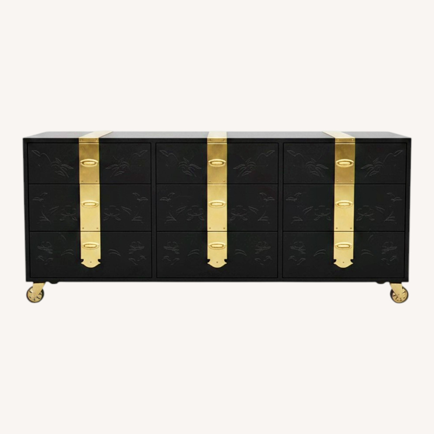 Seller's Notes:✨ Vintage-Inspired Black & Brass Statement Credenza / Dresser ✨ Absolutely stunning oversized dresser/credenza finished in a rich matte black with bold brass campaign-style hardware. This piece has been fully refinished and designed to feel like a one-of-a-kind luxury find—equal parts modern, moody, and timeless. The hand-applied brass details create a dramatic contrast against the deep black finish, while the subtle etched drawer fronts add an extra layer of artistry and texture you don’t see every day. Perfect as a statement dresser, dining room credenza, or entryway showpiece. 🖤 Details: • 9 spacious drawers (smooth glide) • Solid, heavy construction • Custom black finish with protective topcoat • Brass hardware + accents • Mounted on casters for easy movement This is not a mass-produced piece—you’re getting something truly unique that elevates a space instantly. Styled in a moody, high-end aesthetic but versatile enough to work in modern, eclectic, or vintage-inspired homes. Located in Monroe ga 30656