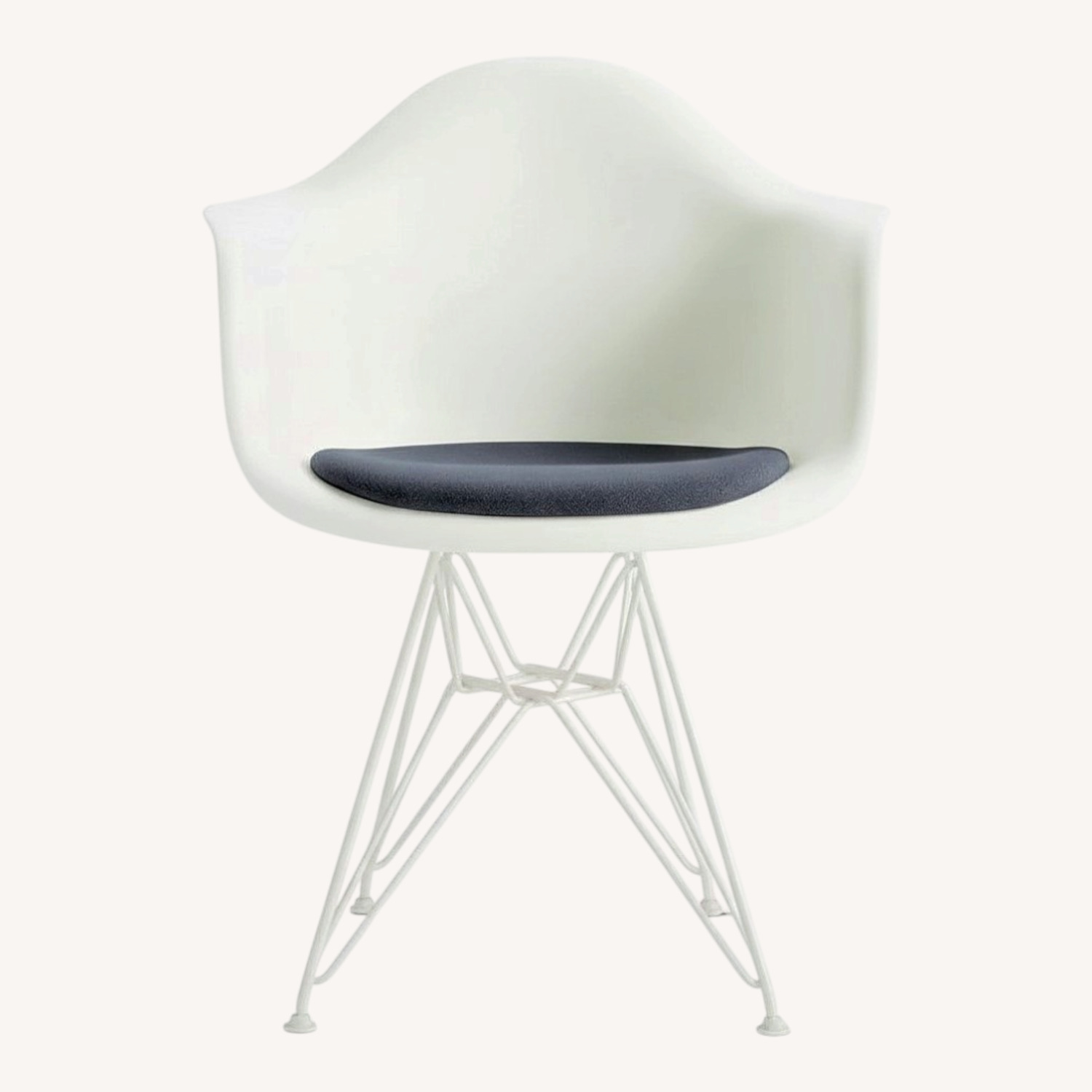 Molded white dining armchairs with affixed grey-blue upholstered seat pads, walnut dowel with black metal bases (very good condition)