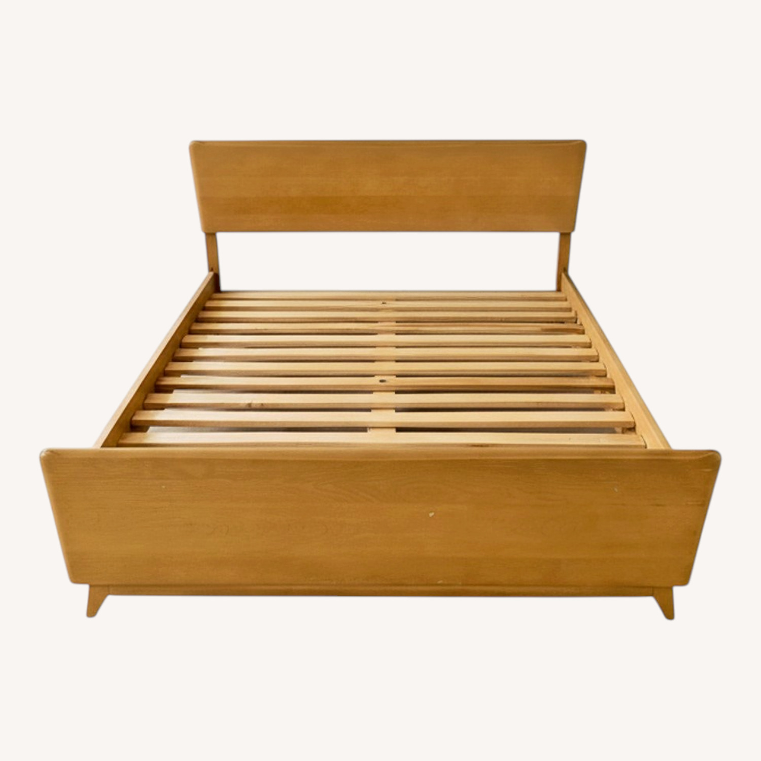 Seller's Notes:Beautiful full size Heywood-Wakefield wood bed frame featuring clean lines, softly rounded edges, and tapered legs. This platform-style frame includes solid wood slats, so no box spring is required. The warm honey-toned finish and minimalist silhouette make it an easy fit with a wide range of interiors—from modern to vintage-inspired spaces. A timeless and functional piece that works perfectly in any bedroom. Features: Solid wood frame with slatted base Integrated headboard and footboard Classic mid-century modern design Sturdy and well-constructed Condition: Good vintage condition with some minor wear consistent with age (light surface marks—see photos). Structurally sound and ready to use.