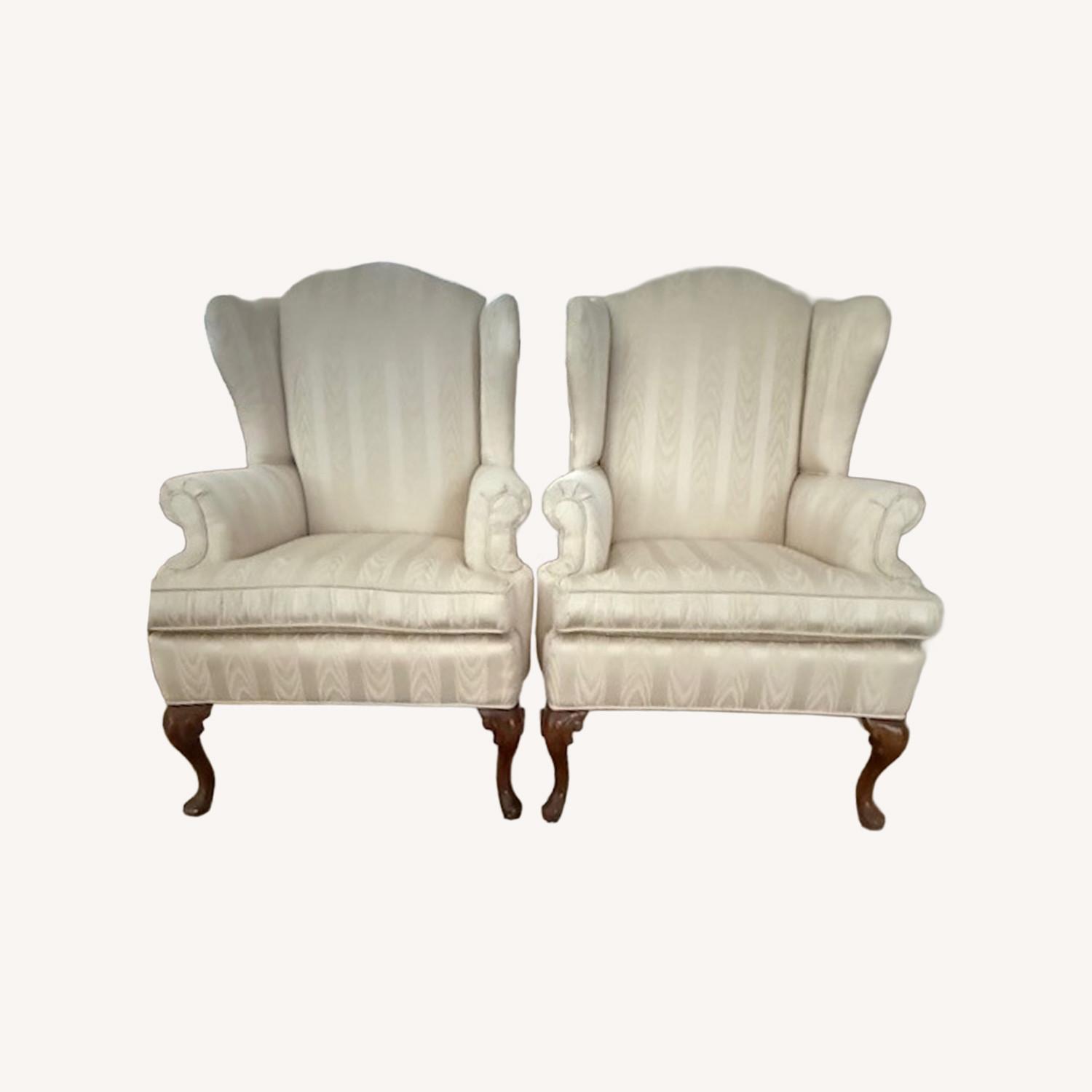 Seller's Notes:Upholstered Arm Wingback / High Back Accent Chairs These will be sold as a pair. The manufacturer established the color as Oyster. These chairs have been lovingly cared for in a home where there were no pets and no smokers. They were used as accent pieces in a formal living room which was seldom used. They are in excellent condition. There are no rips, frays or stains. They are solidly constructed and do not wobble.